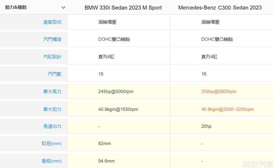 動力同樣搭載2.0升四缸渦輪,但帳面數據是由賓士代表獲勝,C 300另有48V輕油電輔助,除了馬達能額外出力20hp之外,亦支援節能滑行功能,當車輛在穩定行駛狀態下,駕駛鬆開油門後,引擎就可完全關閉以滑行方式前進,進而降低油耗與排汙。