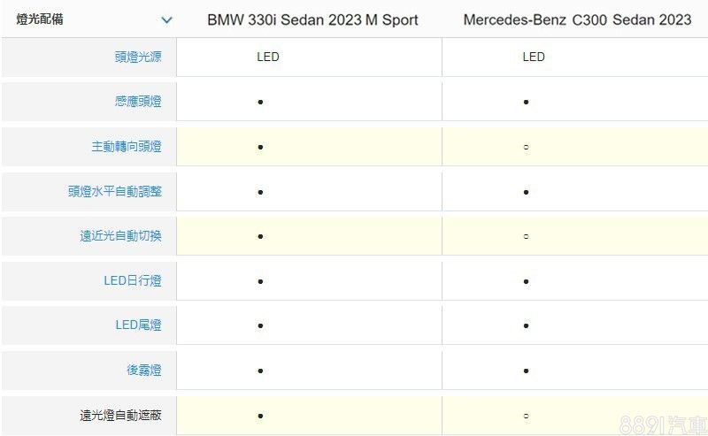 3系列標配光型變化智慧LED頭燈,具備遠光燈調節、自動遮蔽燈功能,照明更廣、也不會造成對向來車眩光,提升行車安全;反觀C-Class僅標配標準型LED頭燈,上述功能都得選配。