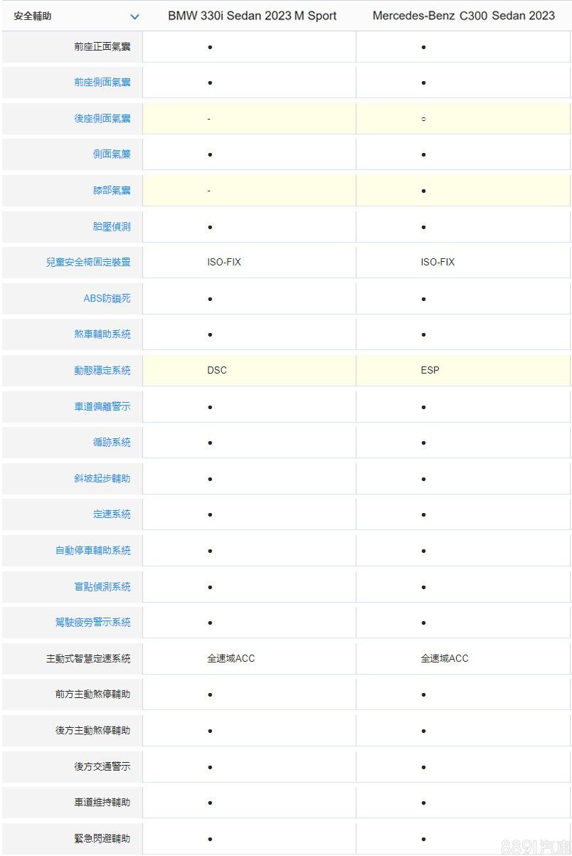 主動安全部分旗鼓相當,都有全速域ACC+車道維持,達到Level 2半自動駕駛輔助,兩車較明顯的差異是在被動安全,C 300多了膝部氣囊,也供後座側面氣囊可選配,當不幸發生事故時多一分保障。