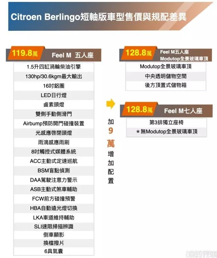 Berlingo短軸版國內提供三款車型,無論動力、配備及駕駛輔助系統皆相當,主要差異就是座椅配置,五人座還有長軸版沒有的Modutop全景玻璃車型可選。有趣的是售價相當,就看消費者想要「務實」一點多2張座椅,還是「浪漫」一點有玻璃車頂。