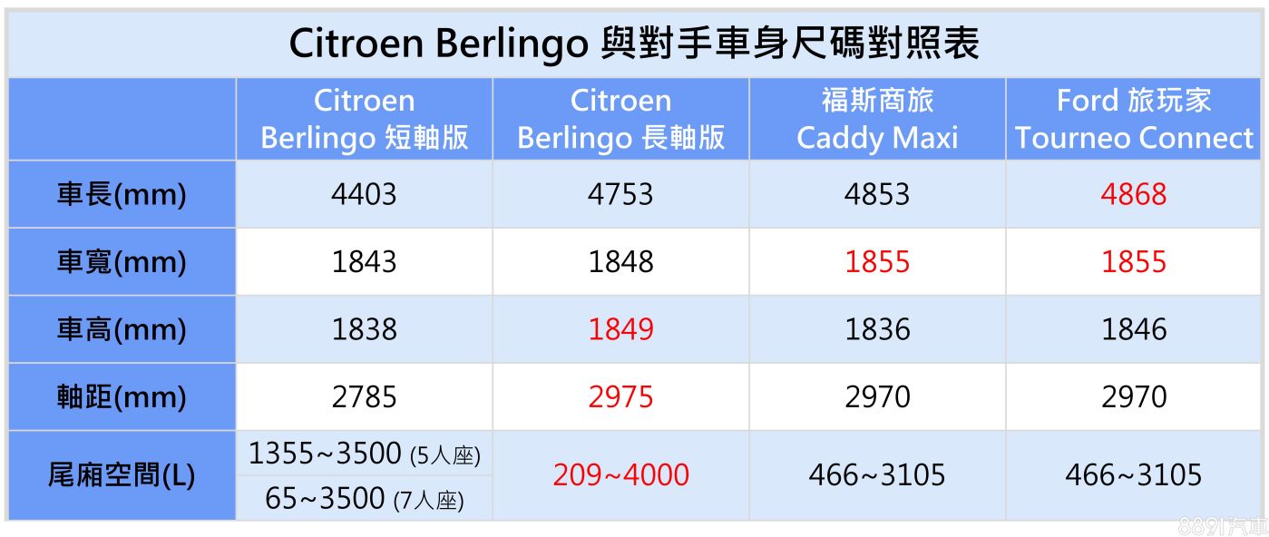 Berlingo在國內最直接的對手便是福斯Caddy Maxi與福特旅玩家,然而「雙福」在國內僅供單一軸距七座版本,成為了Berlingo短軸最佳的進攻時機,而自官方提供數據可見,這類MPV買家在意的尾廂空間Berlingo稍佔上風,就連短軸版表現也不差!