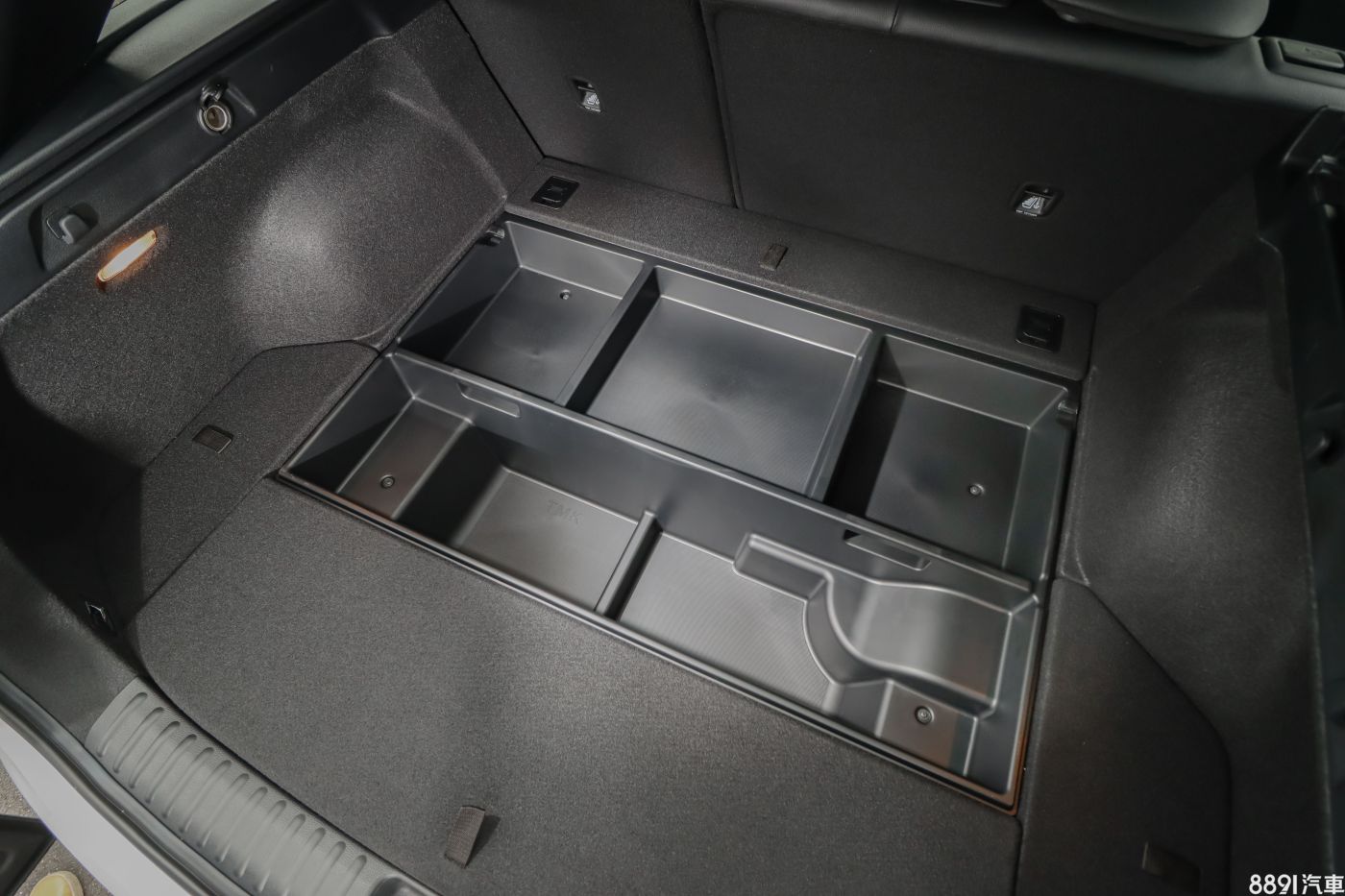 翻開底板其實頗讓人驚喜,因為下方已巧妙規劃三個防水收納盒,無論是洗車工具或是雨衣、雨傘等都能「分門別類」放好,看上去很是舒服,對於有潔癖的車主而言,也不必擔心弄髒行李廂。值得一提的是,最靠內的收納盒深度比其他的還淺,主要是48V系統的鋰電池安裝在下方的緣故。