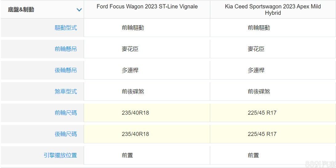 兩款Wagon都是前置前驅設定,搭配前麥花臣、後多連桿的懸吊結構。Ceed Sportswagon鋁圈小對手一吋,胎寬也窄了10mm,配備米其林Primacy 4,是主打低滾動噪音的舒適性胎款;頂規Focus Wagon則採米其林PS4跑胎,不僅迎合車型的運動調性,搭配的紅色卡鉗也更添幾分競技感。