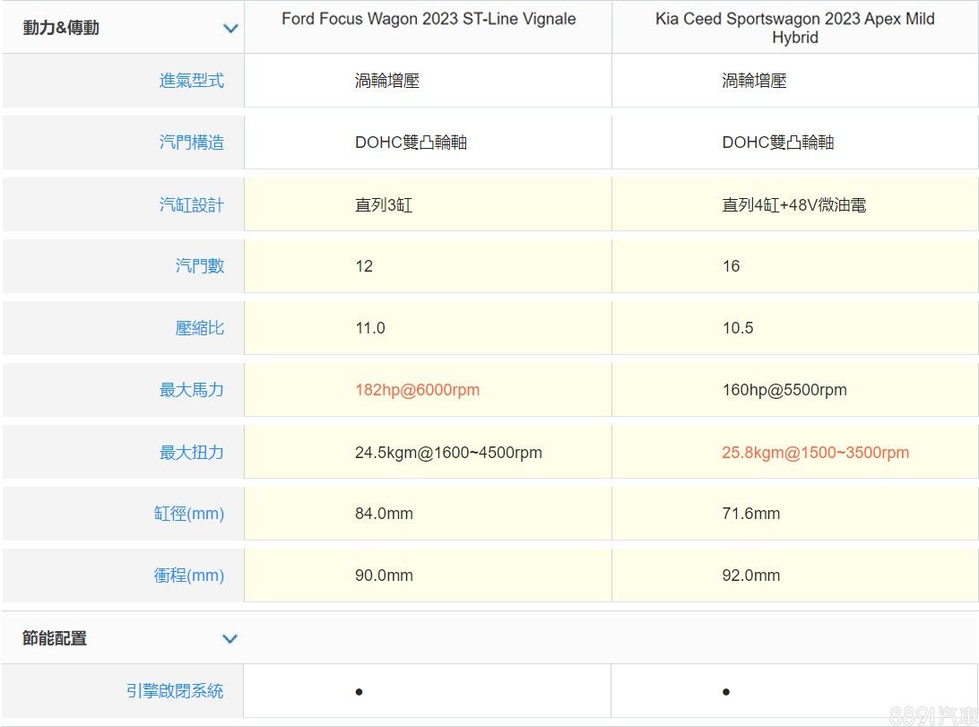 雖說都是1.5升排氣量,Focus Wagon搭載渦輪三缸引擎,Ceed Sportswagon則採渦輪四缸+48V微油電,數據部分,Focus Wagon提供較充沛的馬力供給,182hp峰值比對手多了22hp,甚至堪比市面部分2.0升渦輪車型,至於扭力輸出則是Ceed Sportswagon略多一些。