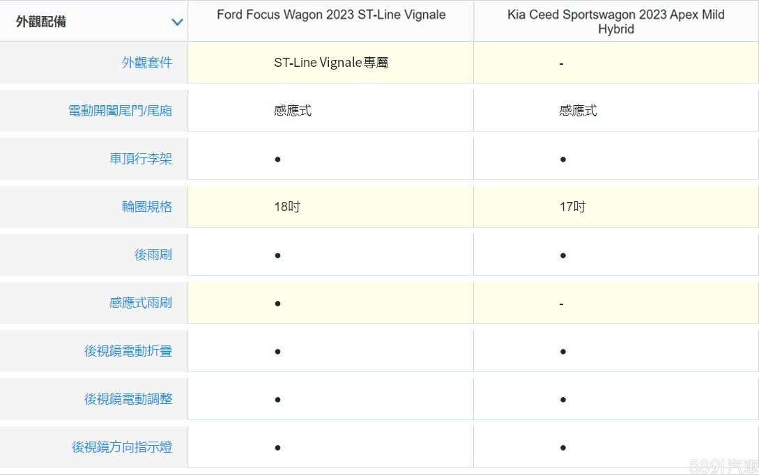 說到運動感,也是兩車外觀主要差異所在,頂規Focus Wagon有著車型專屬運動套件加持,Ceed Sportswagon雖說海外也有GT Line運動風車型,但國內並未引進,其餘配備差異不大,皆具備感應啟閉尾門、車頂行李架等配備,唯Ceed Sportswagon比對手少了感應雨刷。
