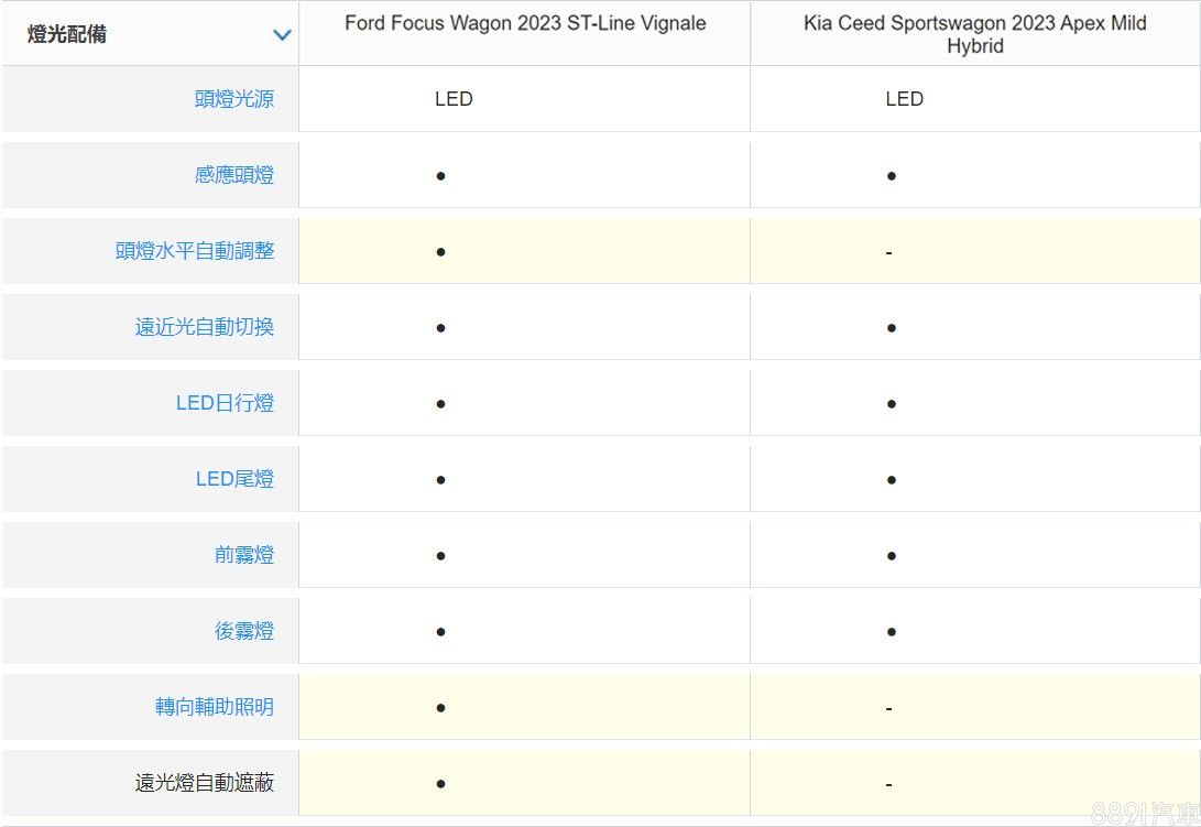 燈光配置上,兩車頭尾燈及日行燈皆採LED光源,不過頂規Focus Wagon配備矩陣式頭燈,擁有自動光型遮蔽、轉向輔助照明等功能,相對地Ceed Sportswagon就連頭燈水平都得手動調整,頭燈科技性較對手遜色。