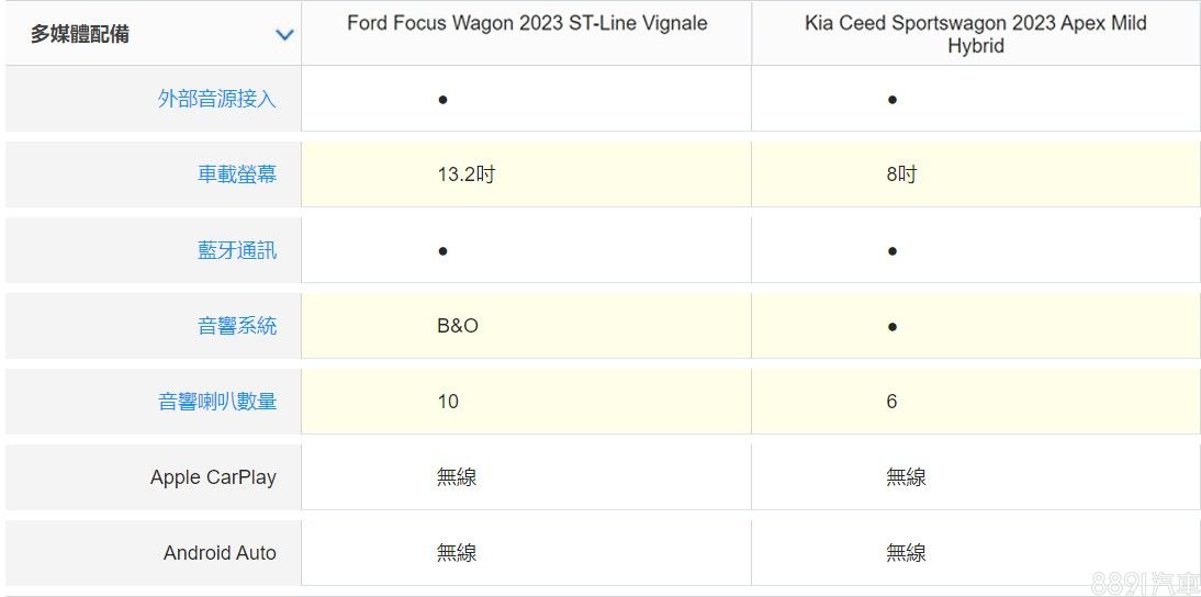 兩車都標配12.3吋數位儀錶,也均支援無線手機連接,不過頂規Focus Wagon另配備13.2吋觸控多媒體系統與10支揚聲器的B&O音響,規格上較對手出色。