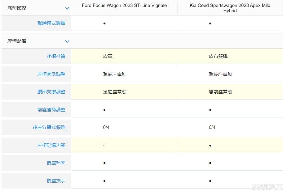 Focus Wagon配備皮質座椅,Ceed Sportswagon則為皮布雙織包覆,功能性則以後者略勝一籌,不僅比對手多了可電動調整的副駕駛座,駕駛座也增加2組記憶功能,若非固定駕駛用車,會是兼具便利和實用的功能。