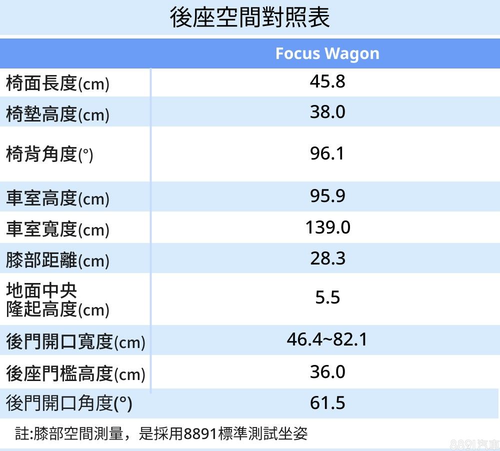 Focus Wagon車長比掀背版多了280mm,但軸距維持2700mm不變的前提下,自然對後座膝部空間沒有太大幫助。實測數據部分,旅行車膝部距離28.3cm與掀背版的28.8cm相去不遠,實際入座後體感也是很接近的,不過旅行車平直的車頂線條,倒是讓頭部空間優化不少,另外後門開口方正、上緣也十分平整,再加上開口角度63.8°,比起不到60°的掀背版大上些許,能對應不同身型的乘客,進出座艙會更為便利。