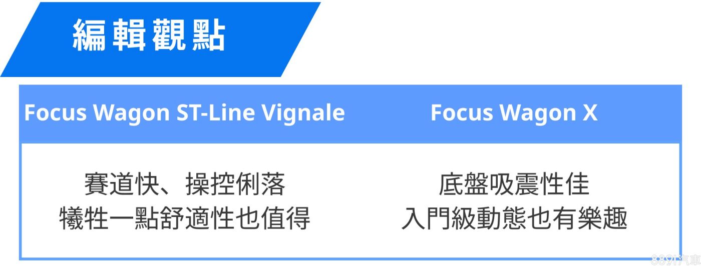國產Focus Wagon規畫單一動力、三款編成,本次來到現場的是最入門的X與頂規的ST-Line Vignale,在車體、動力都相同的情況下,兩車型最大的差異便是底盤設定,標準底盤的入門X版本,真的會比較舒服嗎?ST-Line在賽道上又能快多少?將會是本次超測的重點所在!
