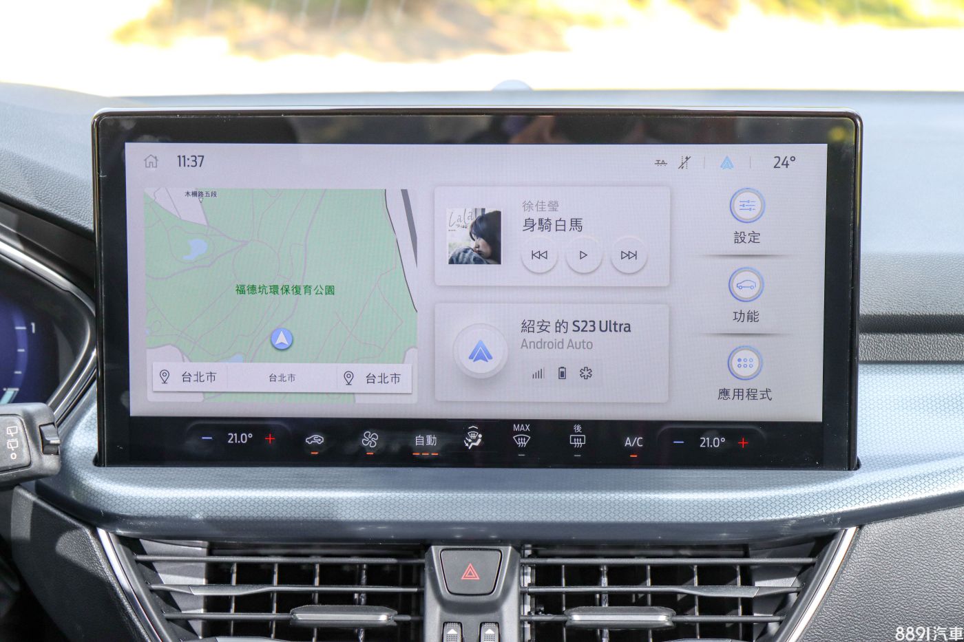 坐進車內,最吸睛的也是本次改款的重點之一:導入SYNC4系統與中控螢幕升級成13.2吋大螢幕。這塊面板的解析度達到2K,重點升級功能有無線的Apple CarPlay、Android Auto,同時空調介面也整合到螢幕上,因此下方的實體按鍵配置與改款前不同,空調旋鈕也改成引擎啟閉開關和音量控制旋鈕。