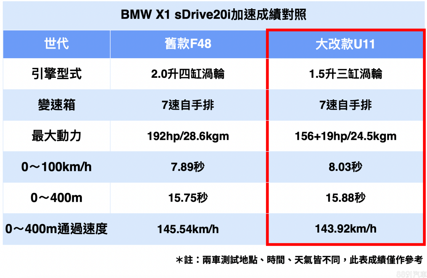 調出前代sDrive20i的加速成績,雖然帳面動力差異不小,但呈現出來的成績卻僅有小幅差距,不過必須說明的是,兩車的測試時間、地點、天氣乃至於路面狀況都不同,並不能直接比較,提供給大家做個參考,但仍可見這套1.5升三缸引擎的表現相當不錯。