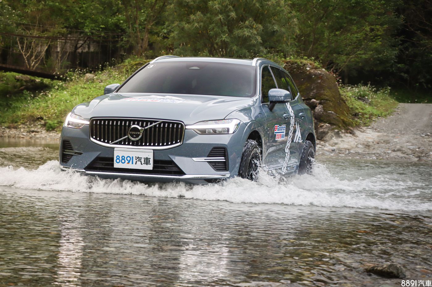 很快地來到路線盡頭的溪流,通常試車到了這邊就會掉頭打道回府,但這回穿上了越野胎當然得下水挑戰看看,首先走近水邊確認水深與底部路況,水深大約20~30cm,溪流底部則是滿布青苔的橢圓卵石,衝吧!謹守著入水慢、油門穩定的原則,XC60搭配Trail-Terrain T/A依然大有發揮,除了耳邊潺潺水聲之外,開起來與乾地沒有太多不同,即使刻意大補油門,車身依然沒有太多打滑,忠實將動力傳遞至路面。