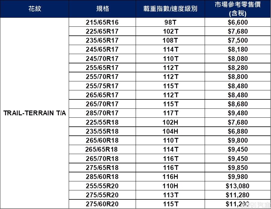 來自米其林旗下的美國百年品牌-BFGoodrich百路馳輪胎,在台發表越野胎款Trail-Terrain T/A,不同於越野胎款通常對應重度改裝越野車,Trail-Terrain T/A目標客群沒那麼硬派,像是RAV4、X-Trail這類都會休旅或者Ranger、Hilux等皮卡車型,都在Trail-Terrain T/A的目標範圍內。百路馳輪胎強調Trail-Terrain T/A雖然定位在越野輪胎,但特別針對花紋設計、膠料配方做出優化,降低以往越野胎碎震多、噪音大的痛點,提升公路行駛舒適性。