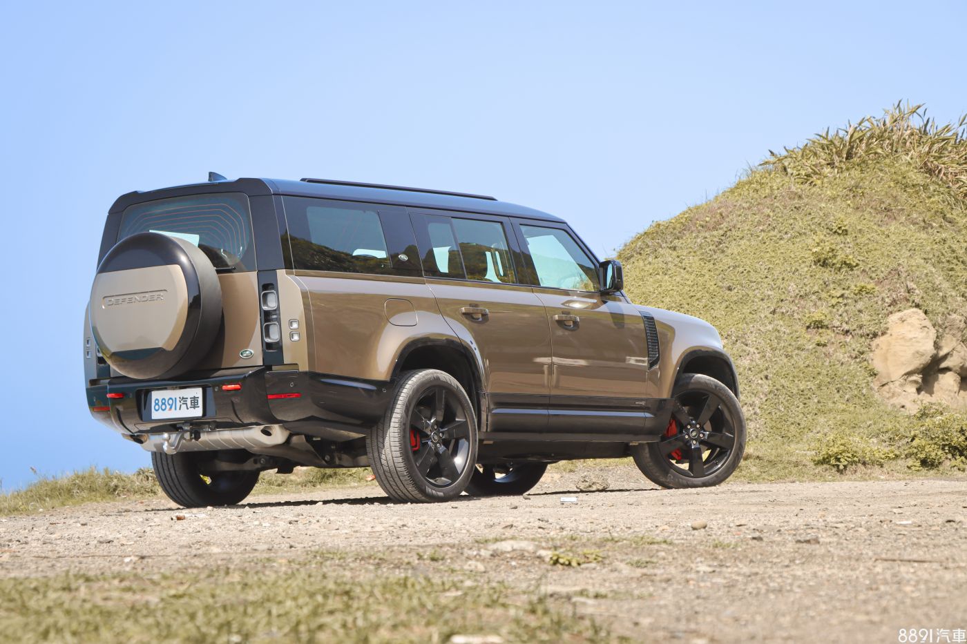 車尾設計大致與Defender其他車型相同,備胎飾蓋採用與車身烤漆同色設計,兼具越野和豪華的風格。