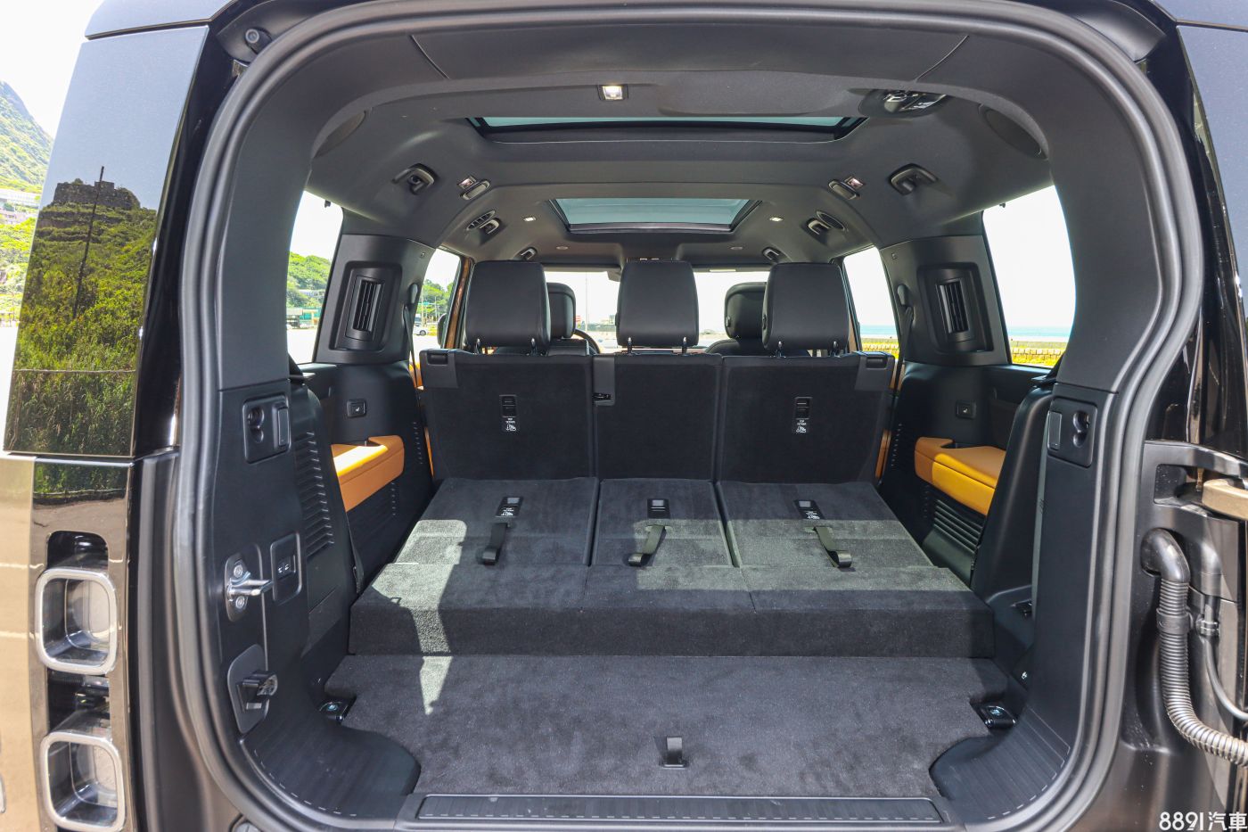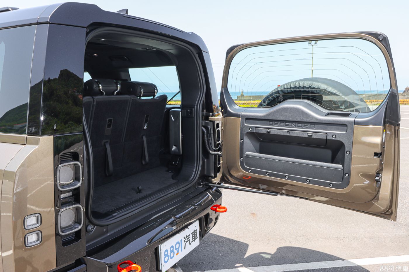 尾門遵循Defender車系的傳統採用側開式,值得注意的是由於車長已逼近五米四,再加上側開尾門開啟之後還會吃掉更多的空間,如果在空間狹小的停車場或市區停車就要特別注意開啟空間是否足夠。