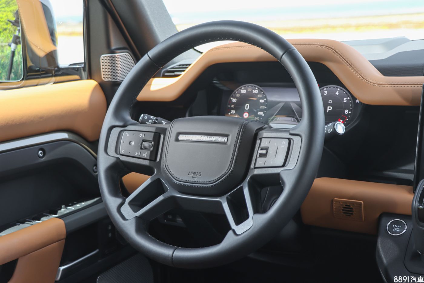 方向盤設計與其他Defender車型相同,採真皮包覆,質感好、握持舒適,標配的全速域ACC主動巡航以及LKA車道維持輔助系統可在方向盤右邊操作,左側則是多媒體、語音助理相關按鍵。值得一提的是內側飾板採用鎂合金材質,可兼具質感和耐用性。