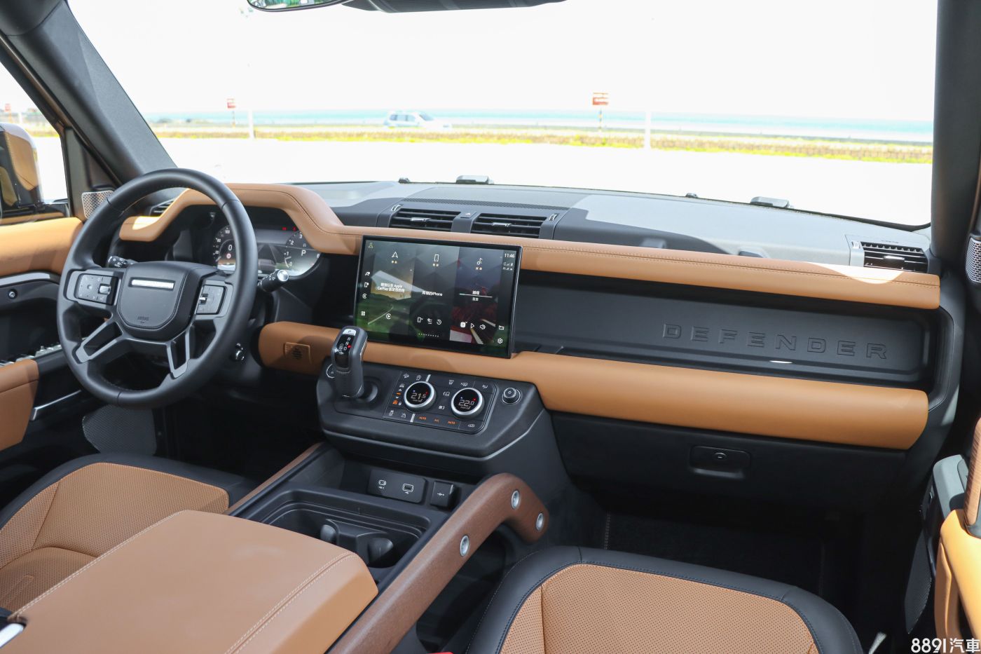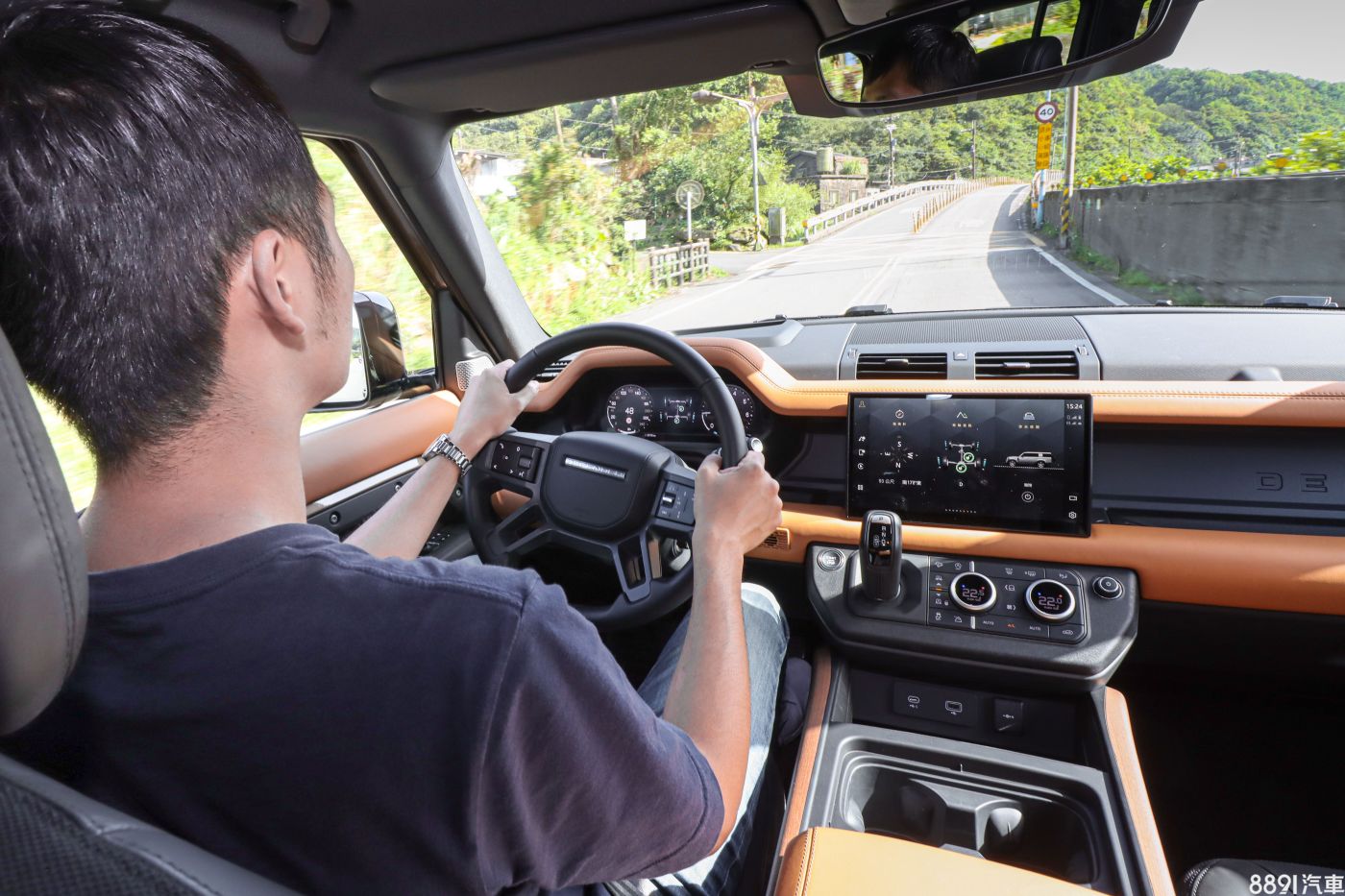 坐進車內再次感受到Defender高大的身軀所帶來的影響,從前擋看出去的視野相當遼闊,至於車室內裝的鋪陳與Defender 110沒有太多不同,採用雙層式造型,多處設計能提供乘客在車身劇烈晃動時握持。質感方面,在儀錶台上方、中央扶手和車門飾板都以溫莎皮革包覆,再搭配試駕車選擇的橘黑色內裝,不論視覺或觸覺呈現的質感都相當出色。