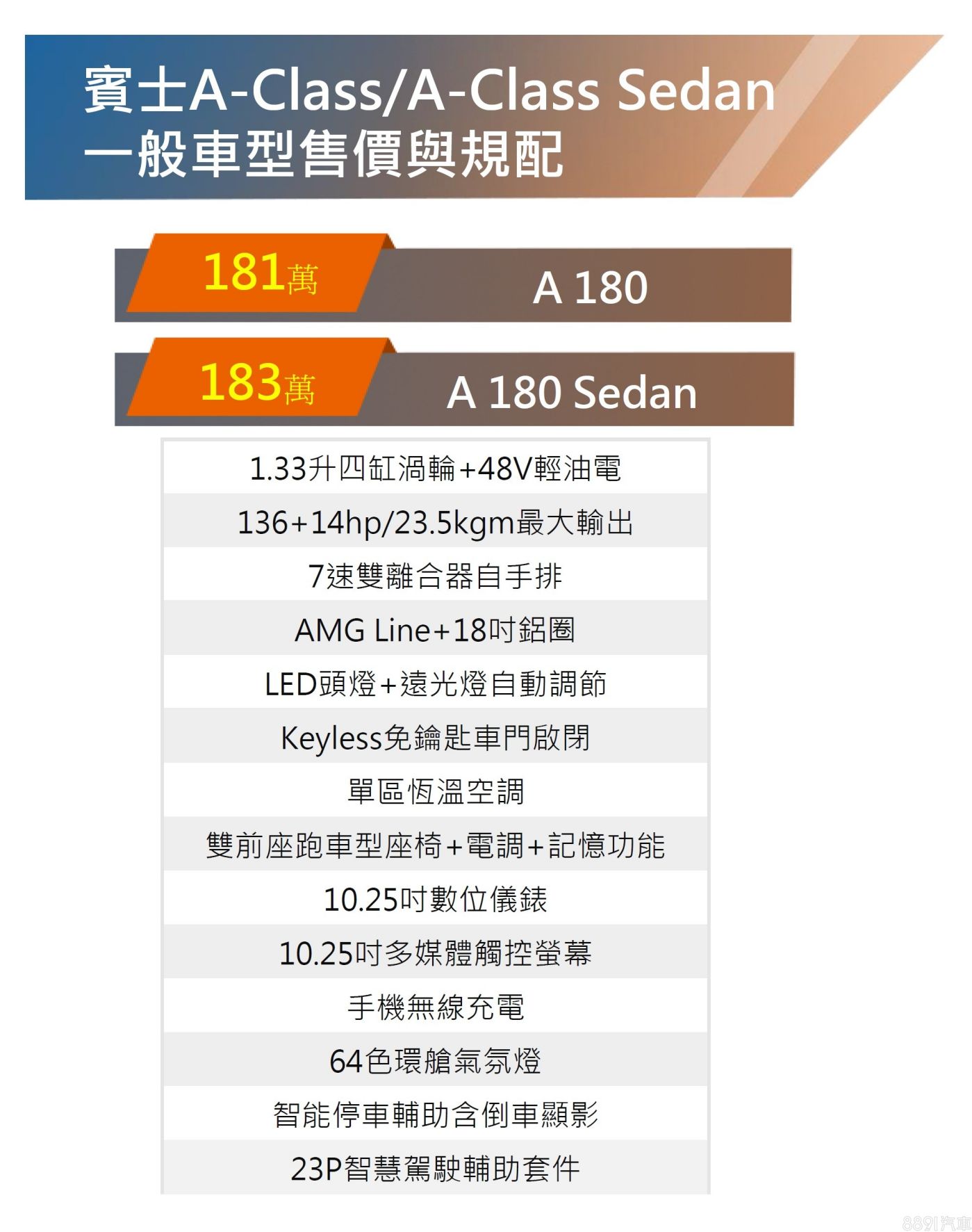 小改款A-Class持續供應五門掀背與四門房車,只不過動力不再有多元選擇,而是僅供A 180單一設定,售價雙雙突破180萬門檻,漲幅多達9萬,價格看似「貴森森」,但其實相比舊款多了48V輕油電科技、MBUX 2.0新系統的10.25吋螢幕、64色氣氛燈、手機無線充電等配備,還要考量近年來的「大環境漲價潮」,算一算價格並沒有漲多少。