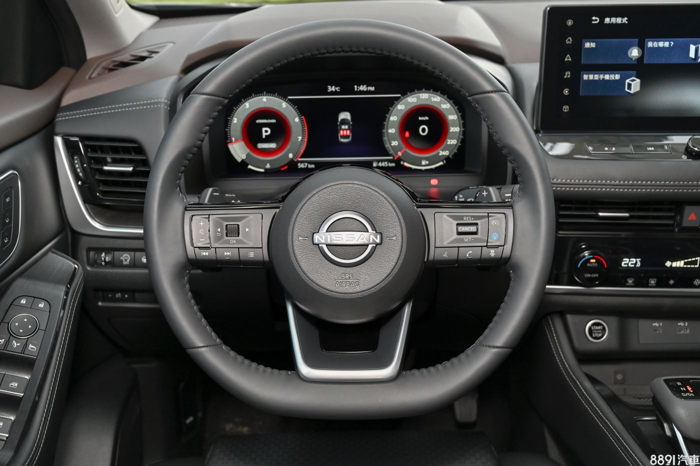 X-Trail的內裝質感讓我印象很深刻,材質使用很豐富,光是中控台就有軟質塑料、皮質、鋼琴烤漆、印刷木紋,中央鞍座與門板則有類金屬髮絲紋,視覺與觸感都是一流,比較可惜的是國產版無法像進口一樣選雙色內裝,如果可以就更完美了。