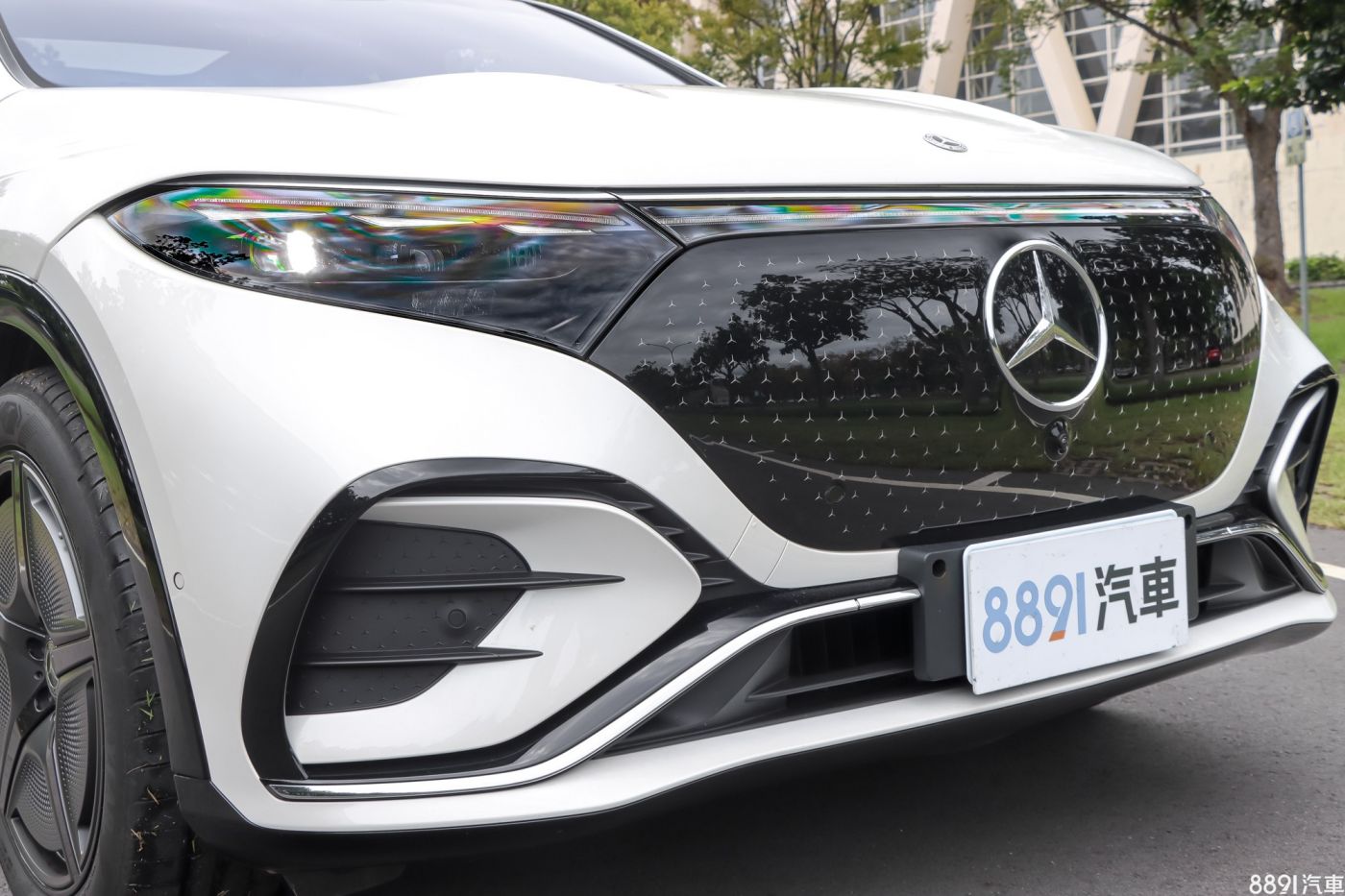 EQS SUV標配AMG Line外觀套件,下方氣壩造型是外觀氣勢的來源,不過裝飾功能大過於實際散熱用途,左右兩側都以塑膠版封閉,降低風阻。標配賓士最高階的智慧型頭燈,除了基本遠近光型變換、還整合照射距離長達650m的超長距遠光燈。另外車輛發動、熄火時也會在前方投射迎賓光幕,儀式感十足。