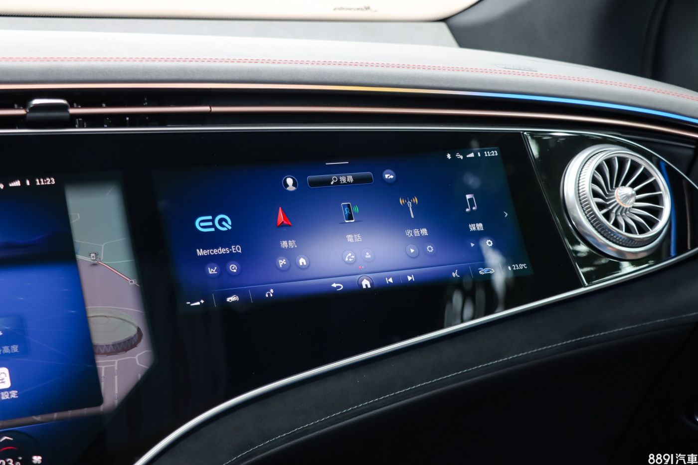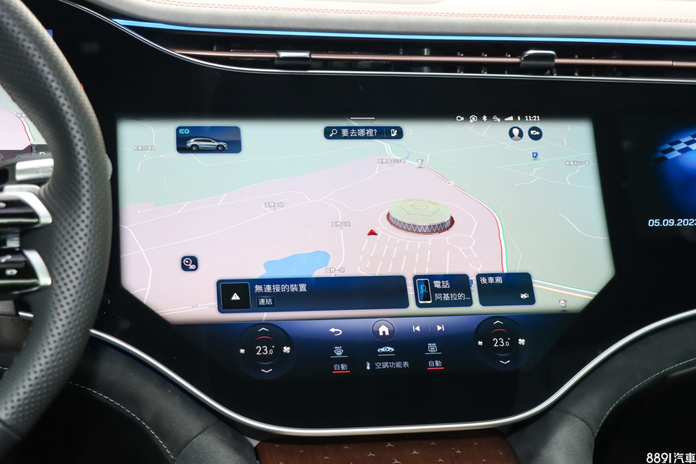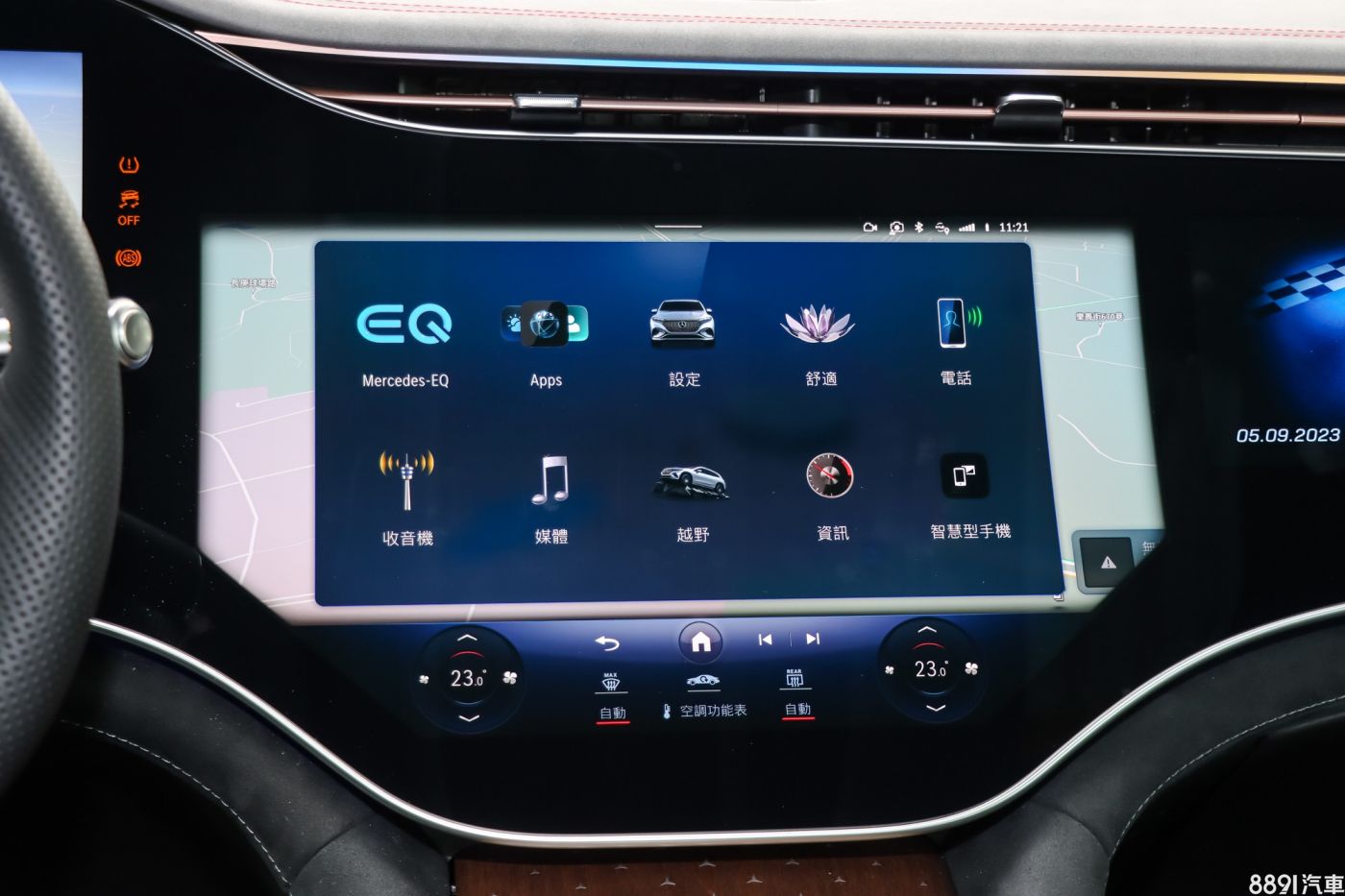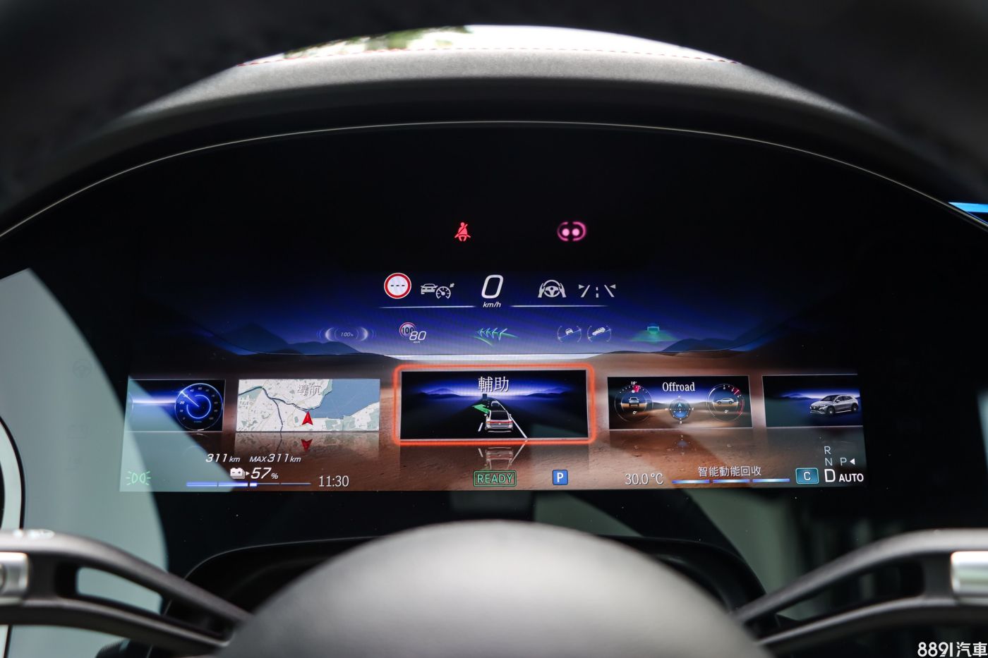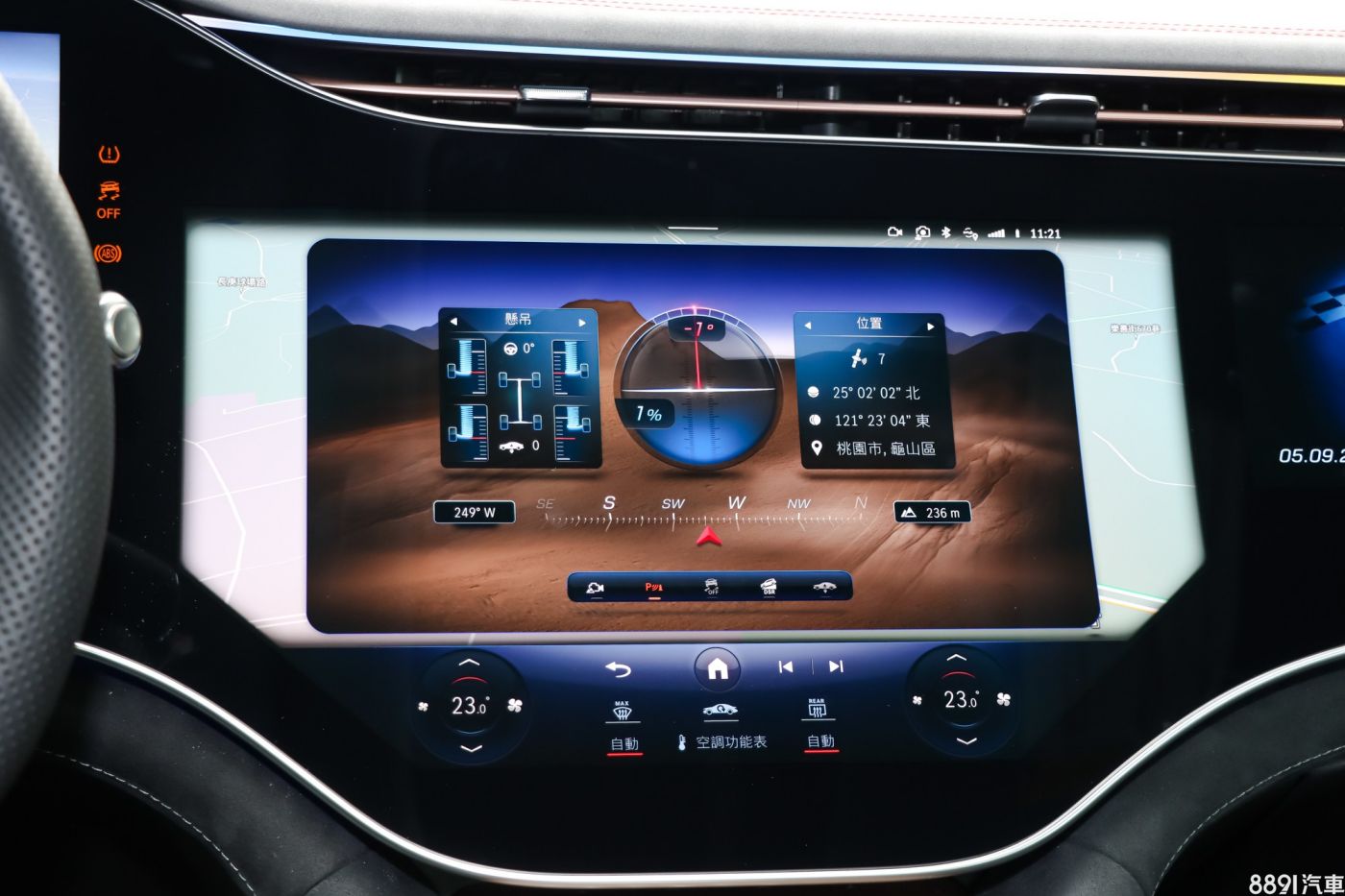 雖說應該沒機會開著EQS SUV去越野,但原廠還是很貼心的附上越野介面供參考,包含車身傾斜資訊、氣壓懸吊運作高度、指南針、GPS經緯度資訊與環景影像等,精細顯示介面看起來還蠻賞心悅目的。