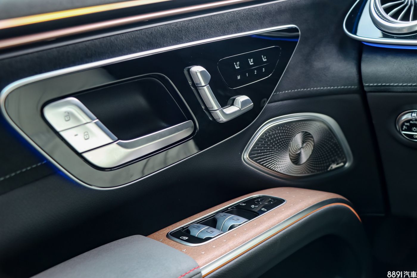 後座部分空間沒話說,膝部、頭部都非常有餘裕,且全景天窗面積延伸至第二排頭部後方,空間感真的很棒。EQS SUV標配第二排電動調整,前後滑移、椅背角度都動動手指就可完成,可惜向後仰躺的角度不大,沒辦法慵懶地在車上躺一下補眠。試駕車選配後座舒適套件,包括小頭枕、後座加熱、手機無線充電座等,選配價格6.1萬元。