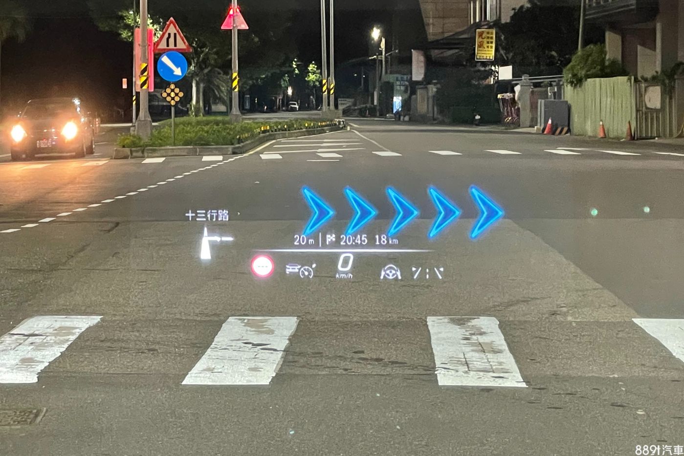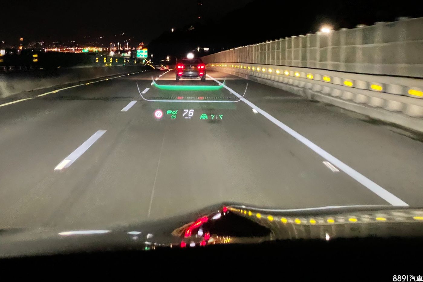 抬頭顯示器其實也提供了完整的駕駛資訊,除了車速、駕駛輔助訊息之外,前方車輛的尾端也有綠色光點,代表ACC主動判斷的跟車目標,不僅能直觀判斷目前車距,重新設定車距時也會有精美動畫顯示,頓時以為自己是科幻電影的主角、正開著戰機在夜間飛馳。
