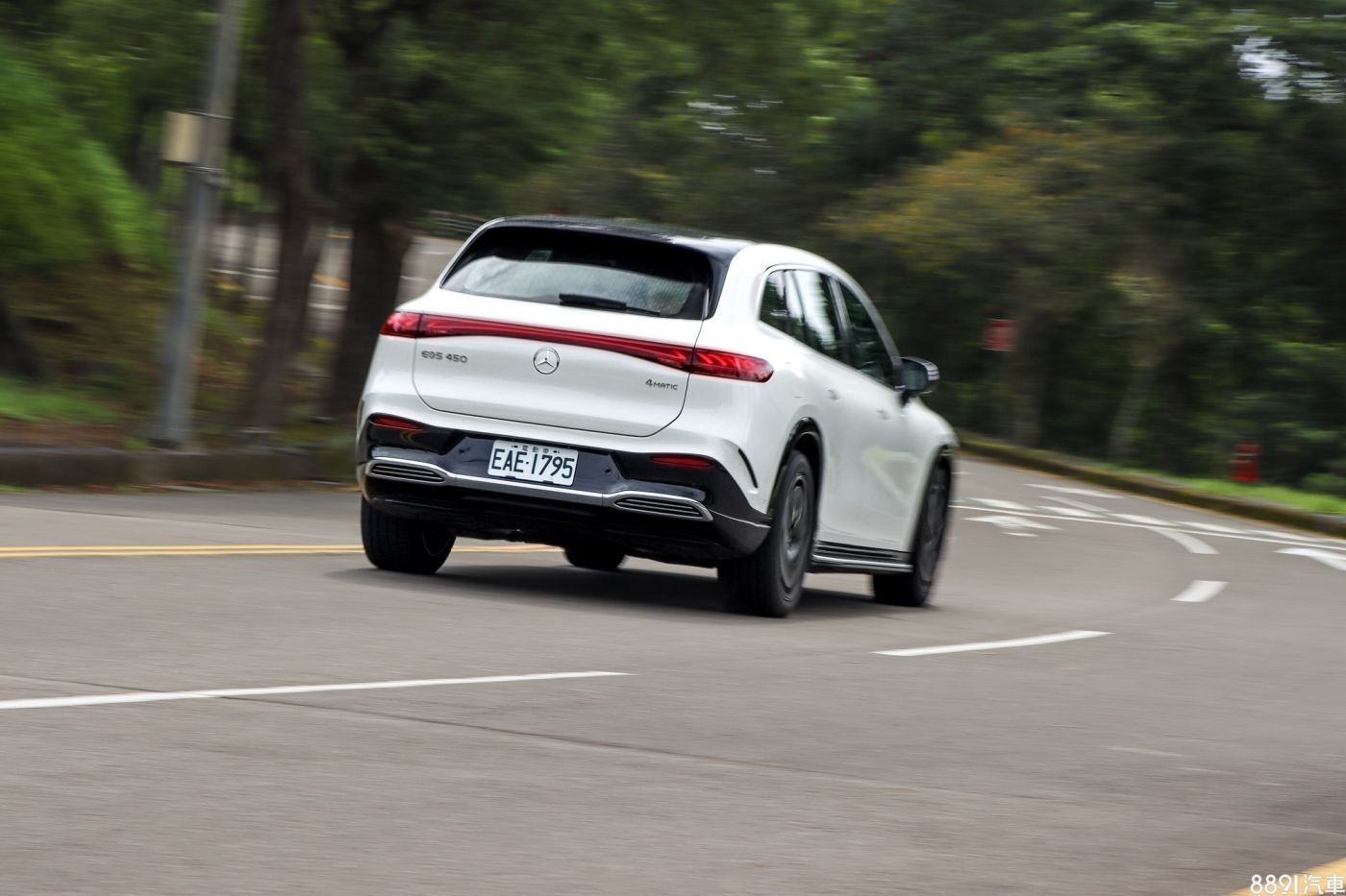 EQS 450 4Matic SUV搭載前後雙馬達四輪驅動,最大馬力360hp、扭力81.6kgm,原廠公佈0~100km/h加速6秒完成,動力儲備雄厚,不同駕駛模式主要改變的是油門靈敏度與懸吊軟硬,油門踩下隨時都能感受渾厚推力,不因2.8噸車重而有所不足。