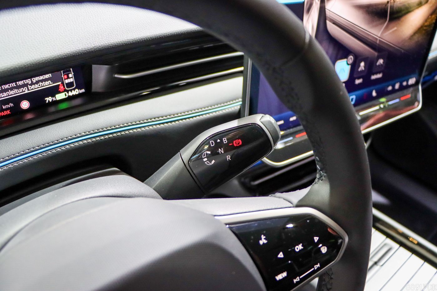 ID.7的排檔也位在方向盤右側,操作方式與ID.4、ID.5相同,都是用旋轉的,不過ID.7把原本在右邊的雨刷撥桿整合到左邊,右邊就只有單獨一支排檔,所以使用上我覺得比較順手,不會再「摸錯根」。