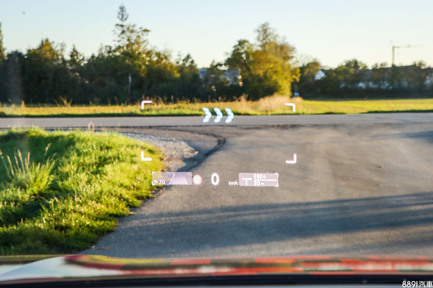 儀錶縮小之後,將重點放在前方的抬頭顯示器,投影尺寸大、能顯示的資訊相當豐富,也加入AR擴增實境技術,在使用原廠導航的狀態下,在交流道、路口會投射箭頭在道路上,科技感濃厚。