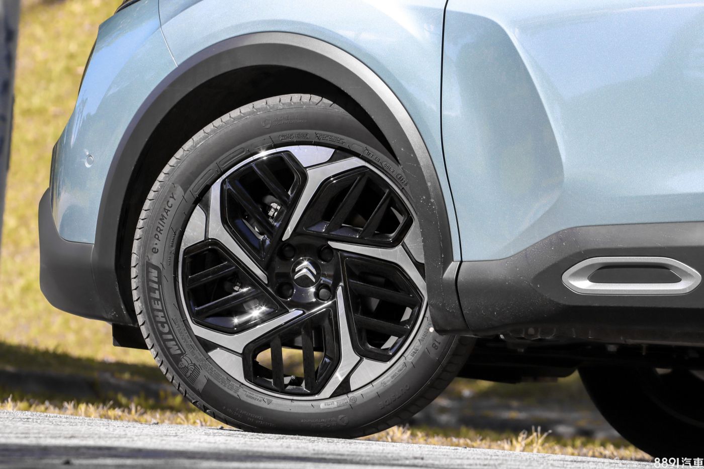 國內C4全車系統一胎圈規格,雙色18吋鋁圈造型獨特,不過偏心式的輪輻設計讓輪圈看起來沒實際的大,配胎採195/60R18的米其林e-Primacy,其實是針對電動車設計、主打靜肅性和低滾動阻力的節能胎款。沒錯!燃油C4連配胎都跟純電款統一了。