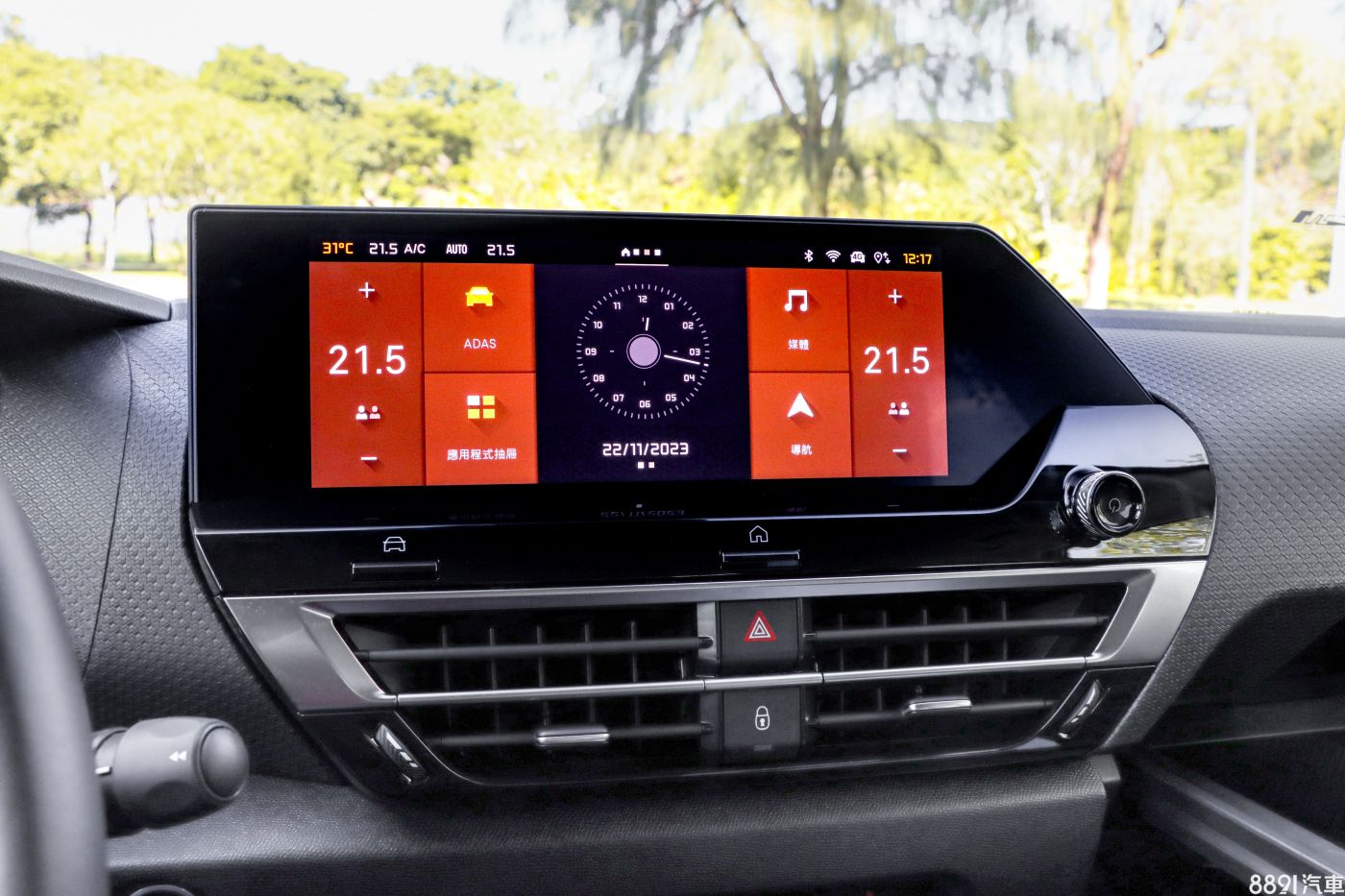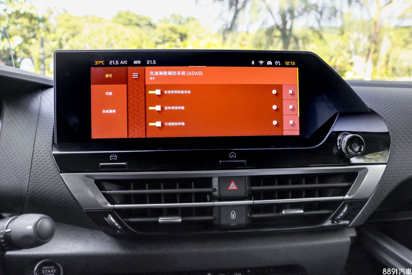 符合Level 2的駕駛輔助系統,除了入門款外皆有標配,試駕的Shine則追加自動遠光切換、盲點偵測和後方車流警示等功能。怠速熄火系統為燃油款標配,雖說不具實體開關,想關閉只能從畫面觸控,操作略感麻煩,不過C4空調送風蠻給力的,即便試車當日氣溫達31度,但引擎關閉後仍不覺悶熱,覺得不用特意關掉也無妨。