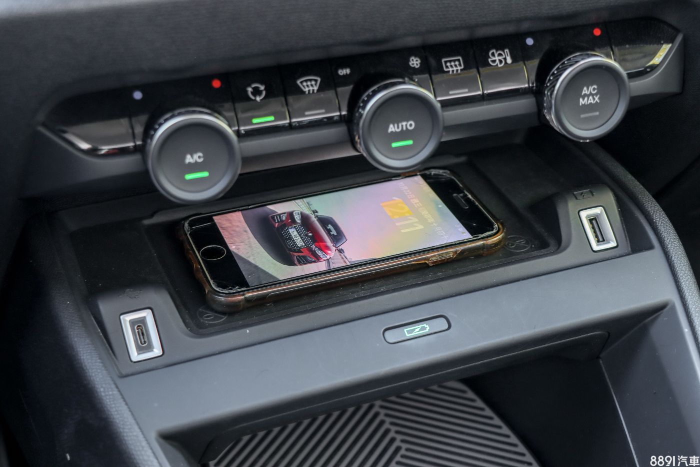 多媒體系統下方為雙區恆溫空調實體介面和手機無線充電座,溫度、風量等空調資訊則顯示於中控螢幕左上角,充電座左右分別設置USB Type-C傳輸孔和USB Type-A充電孔,充電座下方則有雙層置物槽供收納使用。