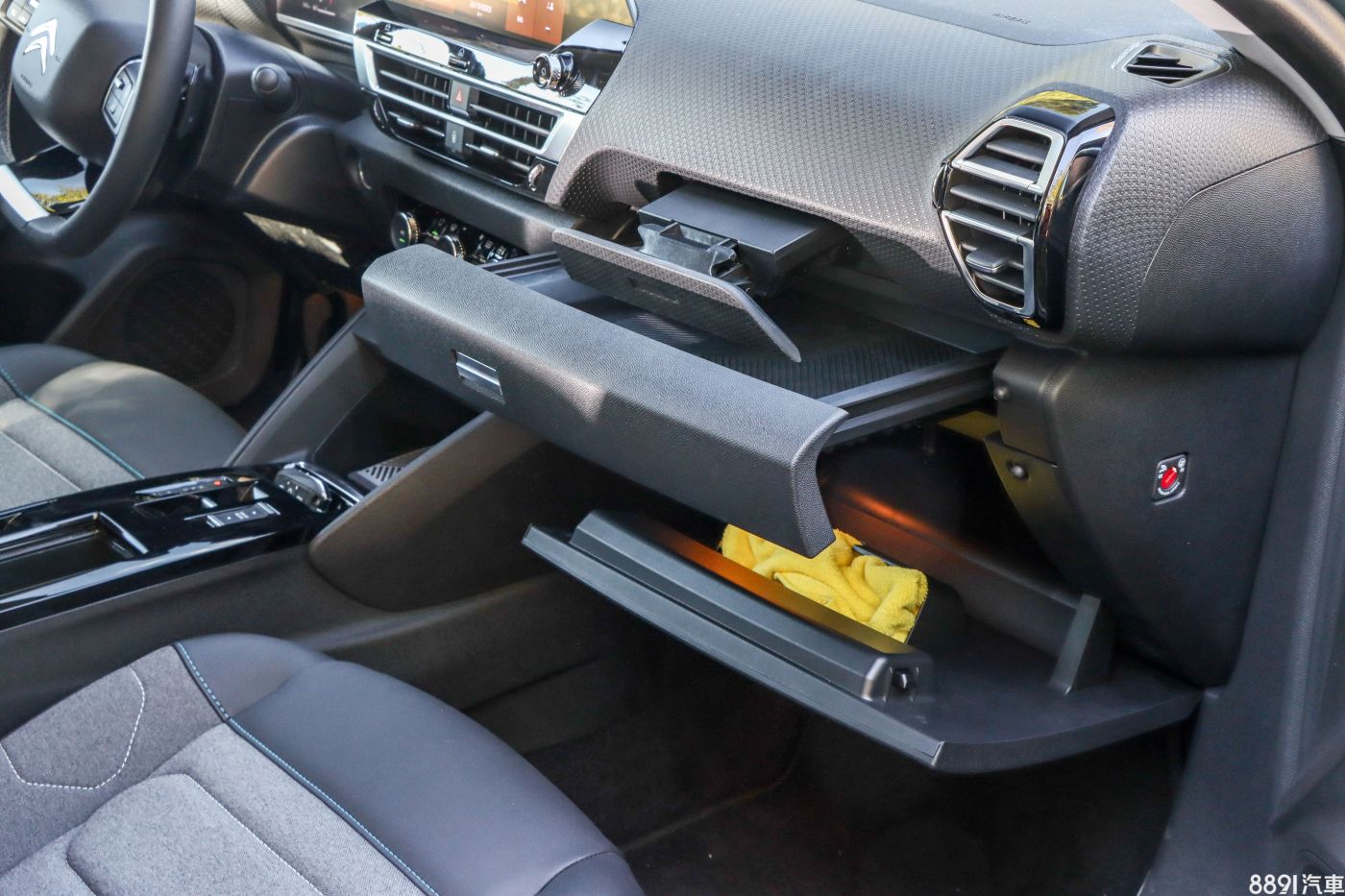 談及收納空間,C4麻雀雖小五臟俱全,除了中央扶手置物箱和副駕駛座手套箱外,手套箱上方還有可放筆記本或化妝包等輕薄小物的抽屜。而作為Shine車型專屬標配,抽屜上方具備平板插槽,能搭配需選配的原廠平板保護套使用,成為簡便型的副駕駛座娛樂系統。