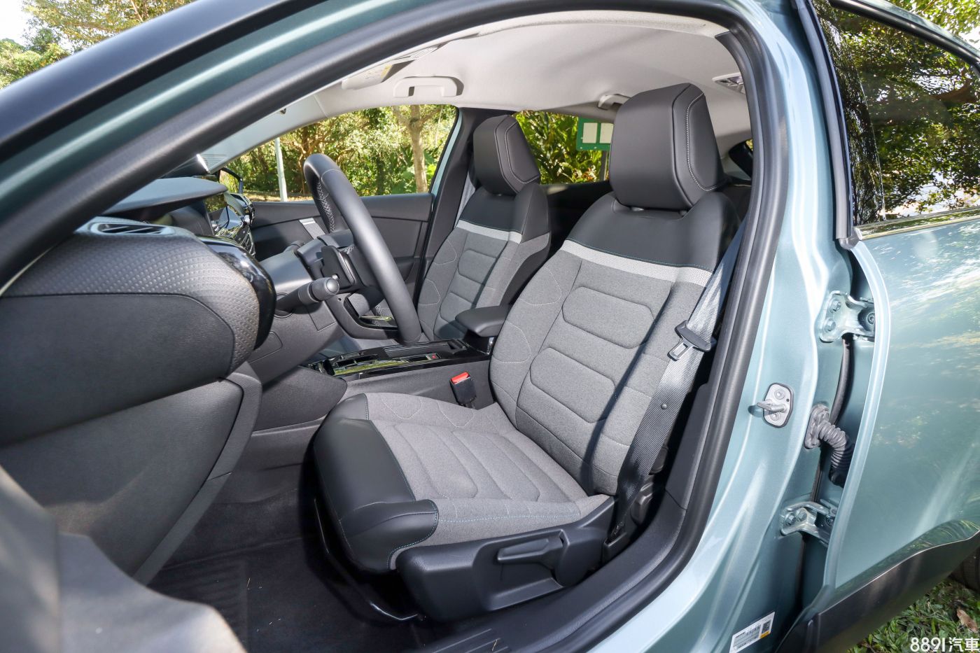 Shine等級標配皮布雙織座椅,頭枕、椅背肩部與坐墊前緣為皮質包覆,不僅造型有設計感,乘坐起來也相當舒適,泡棉柔軟但有韌性,曲面椅背造型服貼,腿部支撐也到位,但須加價6萬升級全皮質座椅才有駕駛座電動調整,否則全車系雙前座都採手動調整。