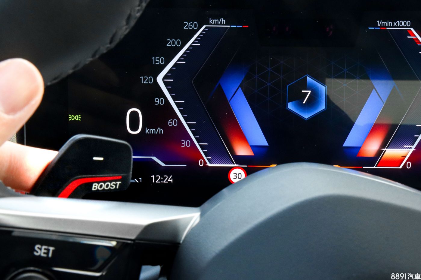值得一提的是,如果在起步前先切入前述Sport Boost模式,起步當下就會有股較強勁的推進力道,能體驗瞬間貼背的「彈射感」,不過後續動力攀升與換檔時機與標準模式並無二致,同樣平穩順暢,實測Boost模式0~100km/h加速成績7.57秒,只比標準模式快0.14秒,雖說數據差異不顯著,但體感樂趣卻十分令人玩味。