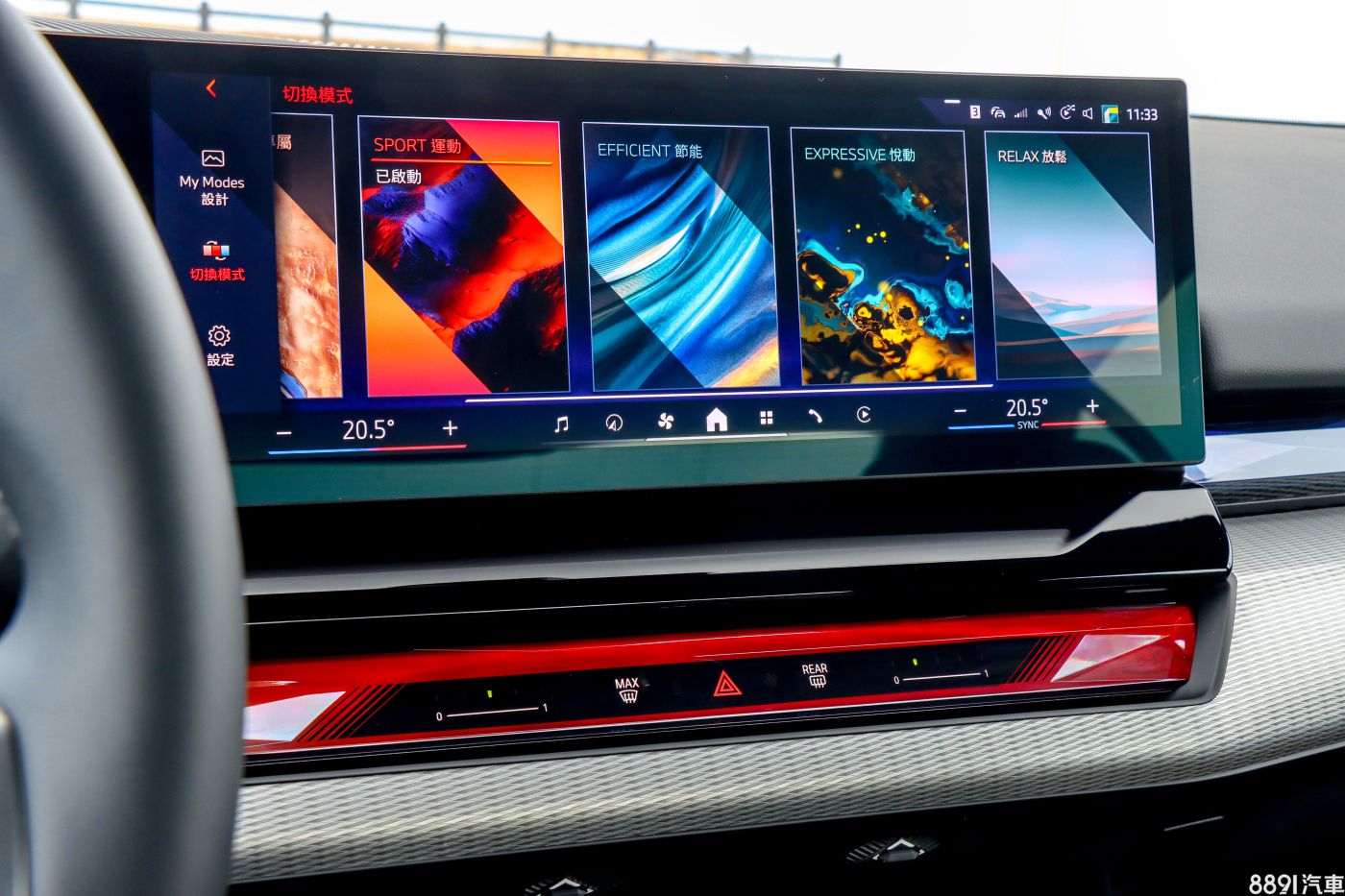 平底方向盤後方的曲面螢幕,整合了12.3吋數位儀錶和14.9吋中控螢幕,搭載OS 8.5作業系統,支援無線手機連結。但可能筆者自己手太短,過於狹長的螢幕,身子得稍微前傾右手才能觸及畫面右緣,且新系統雖然畫面精緻,但畫面切換速度不夠即時,操作步驟也略感繁雜、不夠直覺,要熟悉各項功能操作需要點時間。