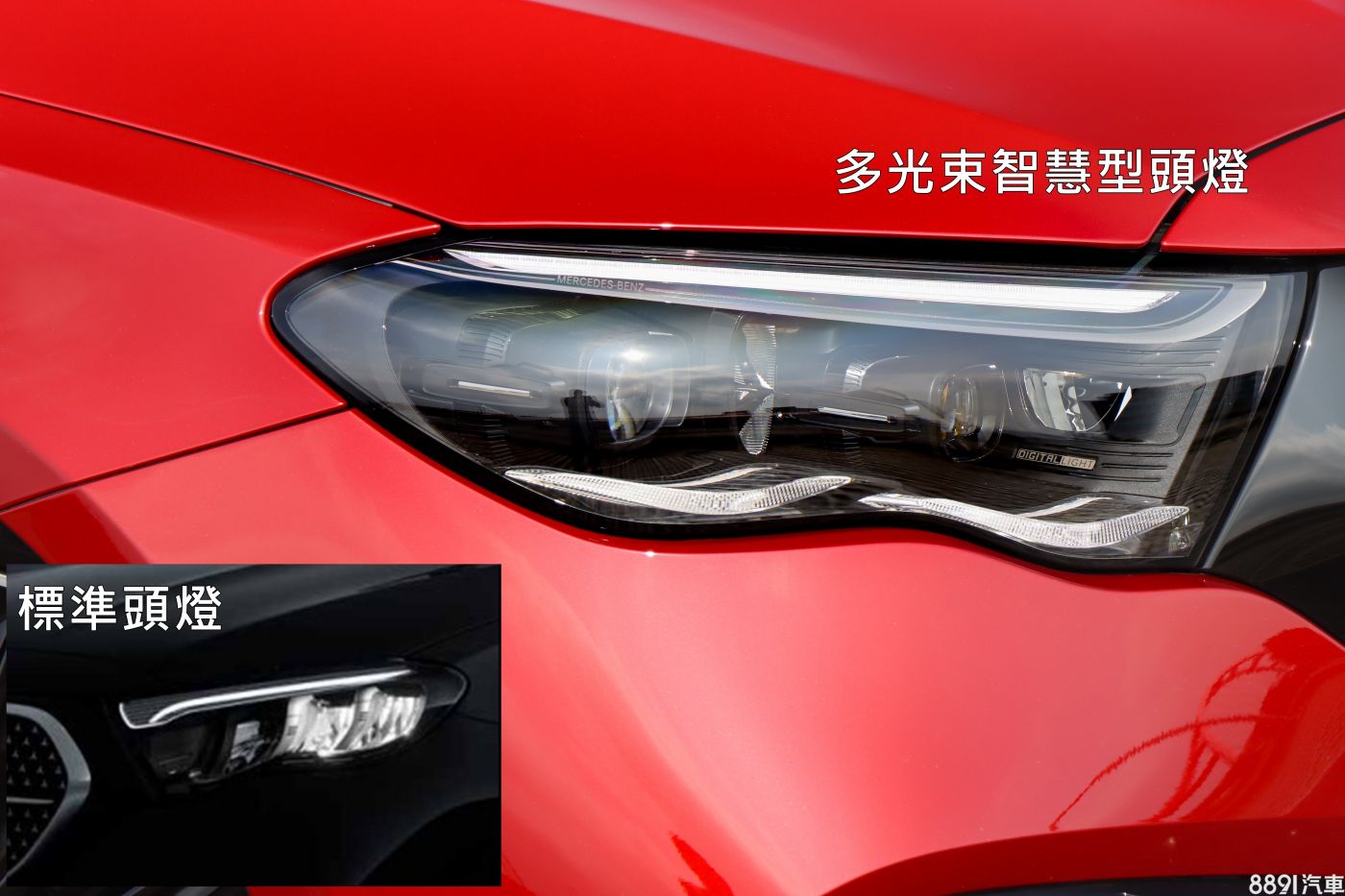 選配的多光束智慧頭燈,在造型上與標準頭燈有所區別,下方多出兩道日行燈,主燈多出自動光型變化,可以更精準辨識來車遮蔽光型,也帶有迎賓燈光秀功能。