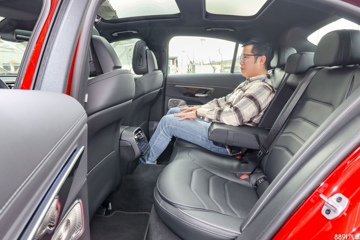 將前座調整成174cm標準坐姿,後座空間表現相當不錯,椅背、椅面角度都很剛好,大腿支撐性也充足,可以良好固定身體,坐起來夠放鬆,試駕車選配全景天窗可以有效增加採光,舒適度會再好一些。