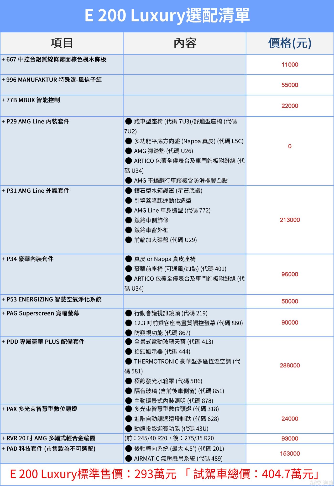誠如上段所言,E 200的目標客群多半是精打細算的商務客,以現在賓士主被動安全標配很齊的情況下,就算買空車不選配,也能夠有不錯的體驗,但這次E 200 Luxury因為是認證的緣故,內外觀扮相、內裝配備,甚至是E 200不開放選配的後軸轉向與氣壓懸吊都包含其中,幾乎能選的全都包,試駕車總價來到404.7萬元,單選配價就達111.7萬元,雖然最終試駕感受一定會與標準版有落差,但集合大改精華於一身,能體驗這「選到頂」的E200依舊讓人期待。