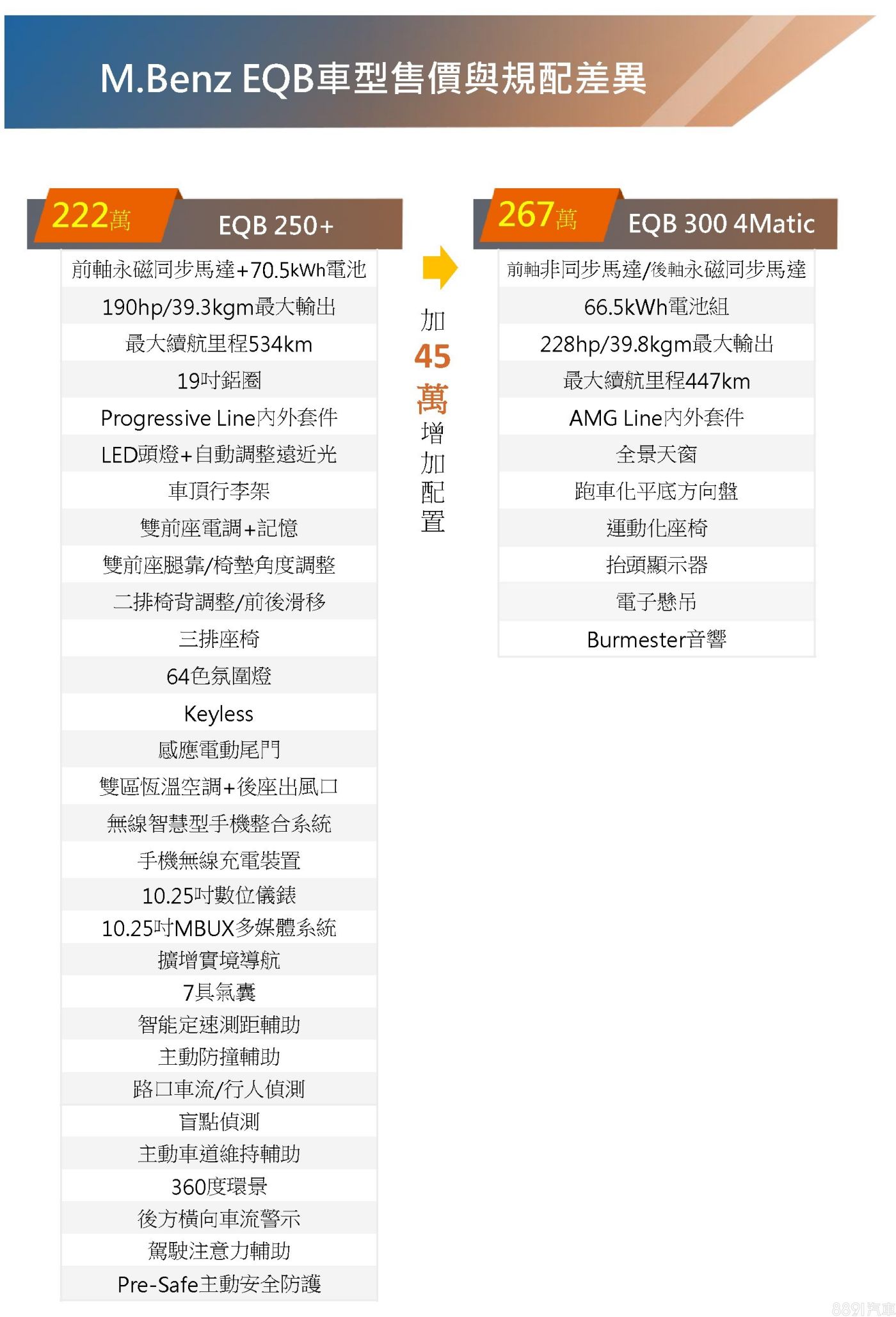 電動車銷售越來越競爭,促銷手段有很多種,像是前陣子的特斯拉降價求售是一種,但賓士作法我認為更聰明,趁著推出小改款EQB之際,加入250+全新增程版之外,既有的EQB 300車型在售價不變的前提下,新增非常多過往需選購的配備,加值配備總值23.7萬元,不破壞價格行情,C/P值卻更勝以往,就是小改款最大重點。