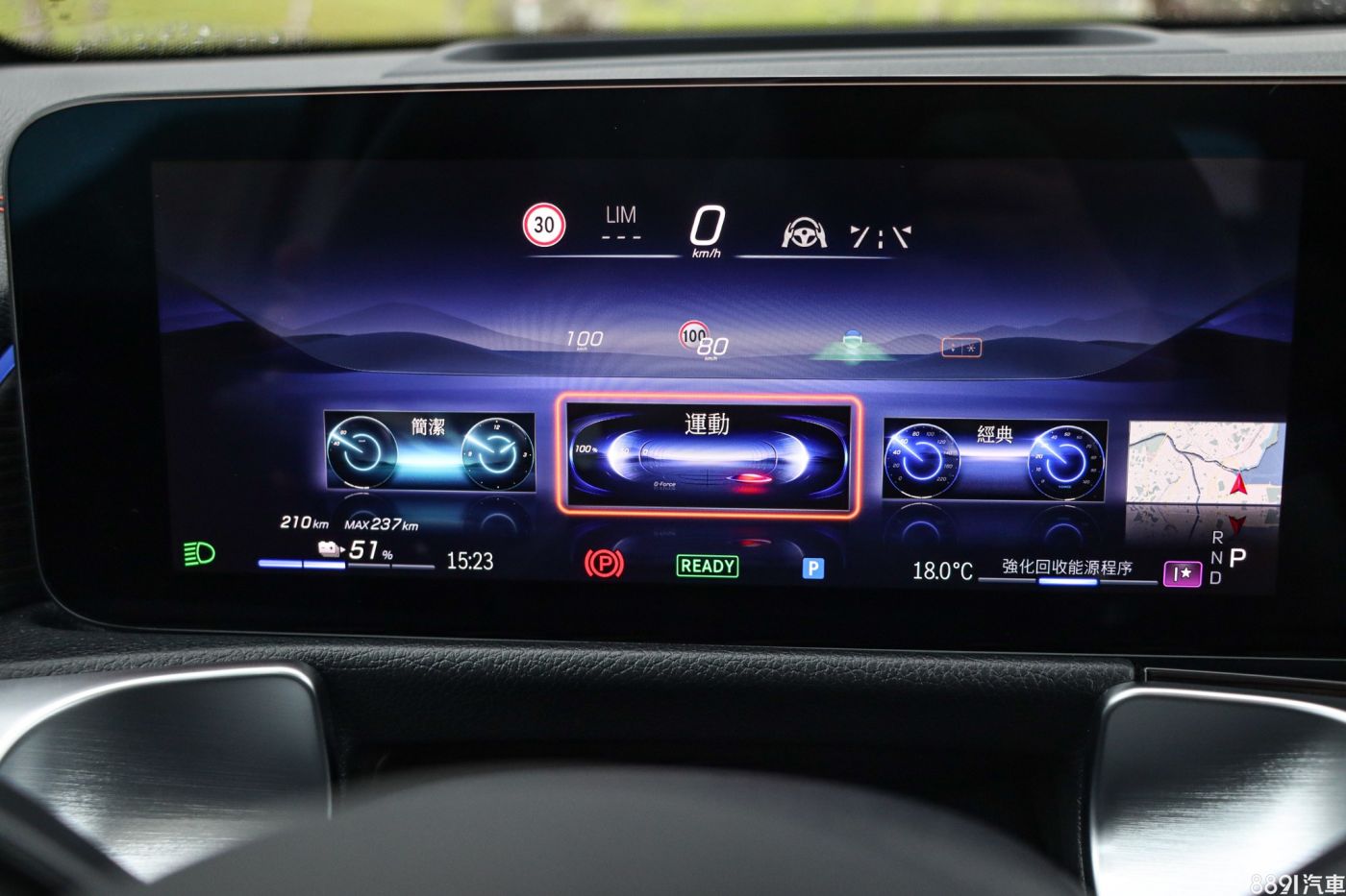 儀錶板與中央螢幕都是10.25吋,儀錶版一樣有多種模式選擇,可以從方向盤左邊按鍵來切換,使用原廠導航時可以滿版顯示。進入設定畫面後,上半部則可選擇抬頭顯示器內容,有基本的時速、主動跟車示意,在導航時一樣能支援地圖顯示。