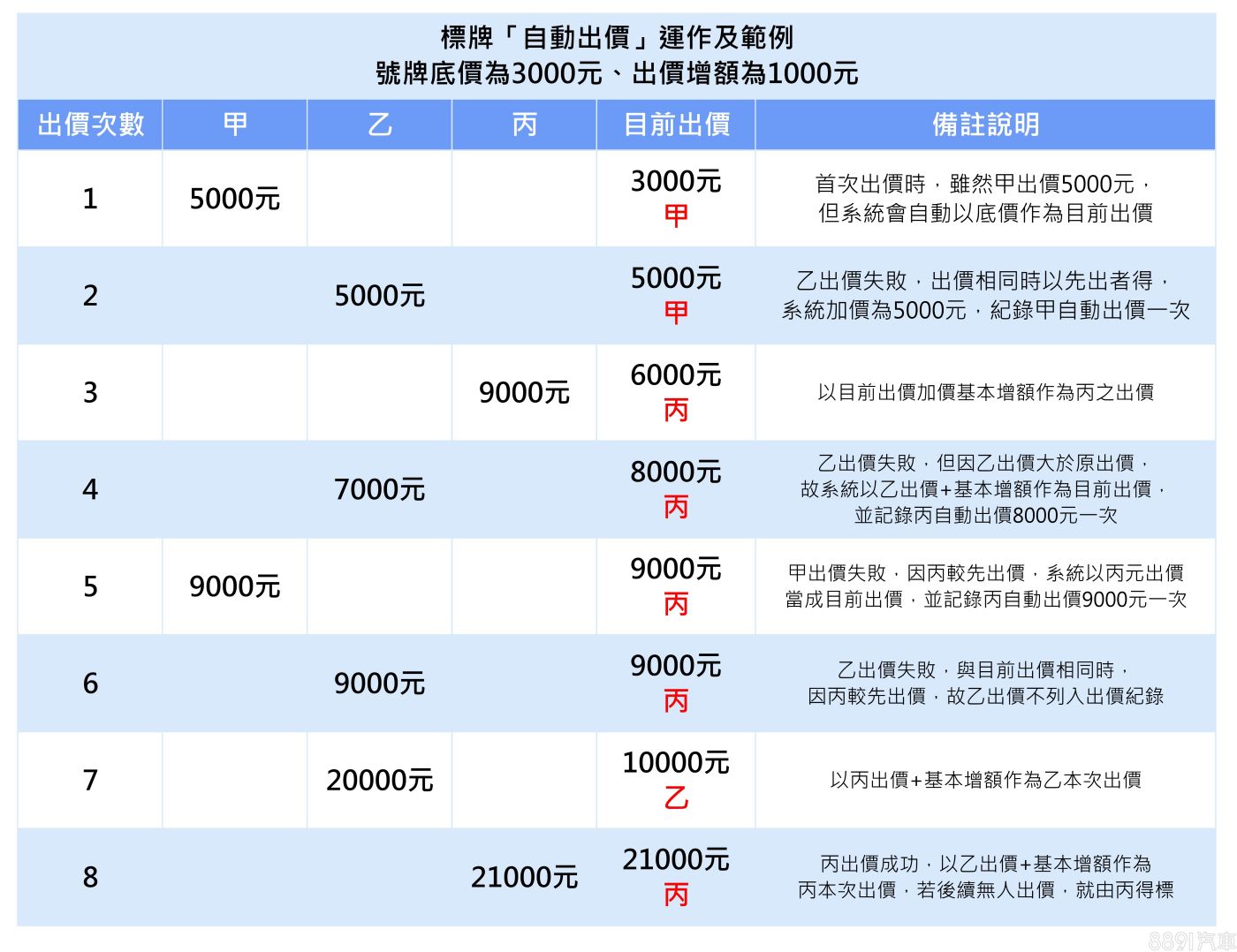 監理服務網號牌從起標到截標通常有三天時間,競標是採取「自動出價」的方式,當出價送出後,系統會以此金額作為你願意出價的最高上限,儘可能讓民眾以最低價格得標,但若兩個競標者輸入的金額相同時,先出價者就會成為當前的「最高出價者」,後續若沒人再加價,就將成功標下此牌號。