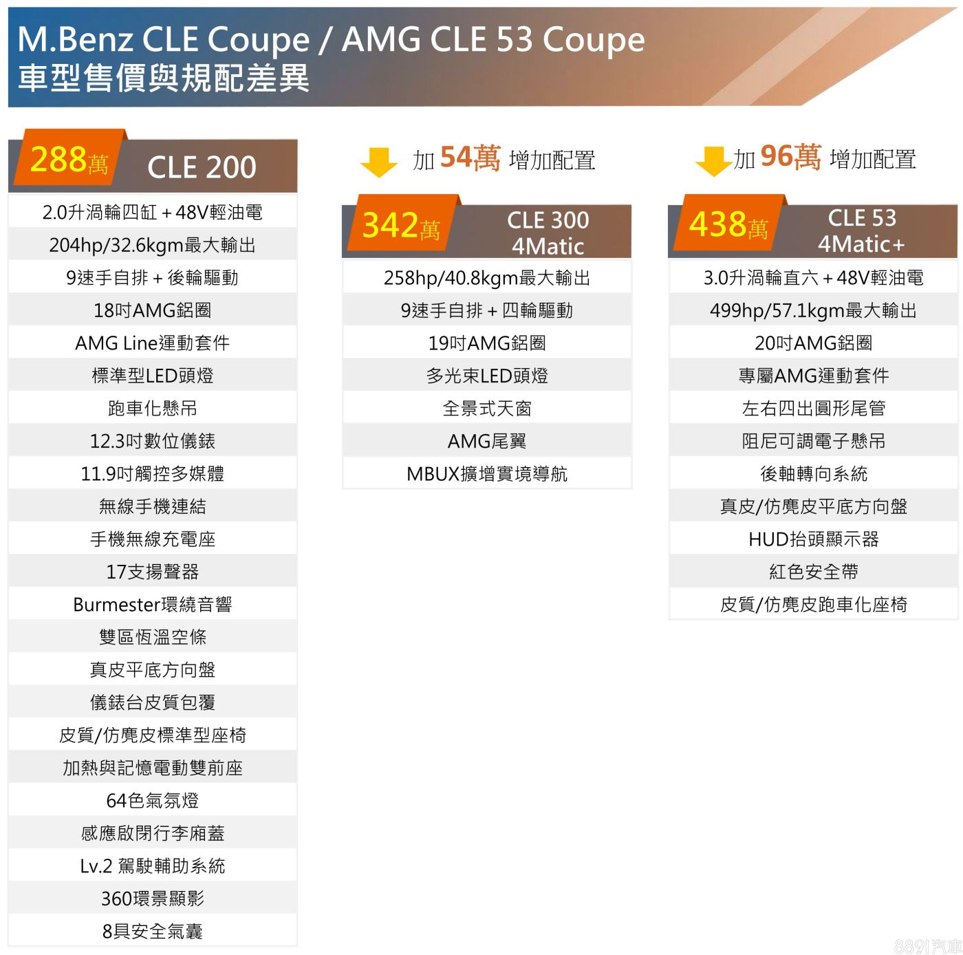 CLE Coupe規劃有三個等級,從定價、動力配置都有作出差異化,鎖定的就是不同取向的買家。最入門的200車型,價格288萬壓在3字頭內,偏向「開帥不開快」的客群,中階的300車型,動力更大、扮相更好,有更多的跑格味,相信會成為販售主力,而頂規AMG 53搭載3.0升直六渦輪,輸出提升好幾個檔次,自然就是車系的性能擔當!