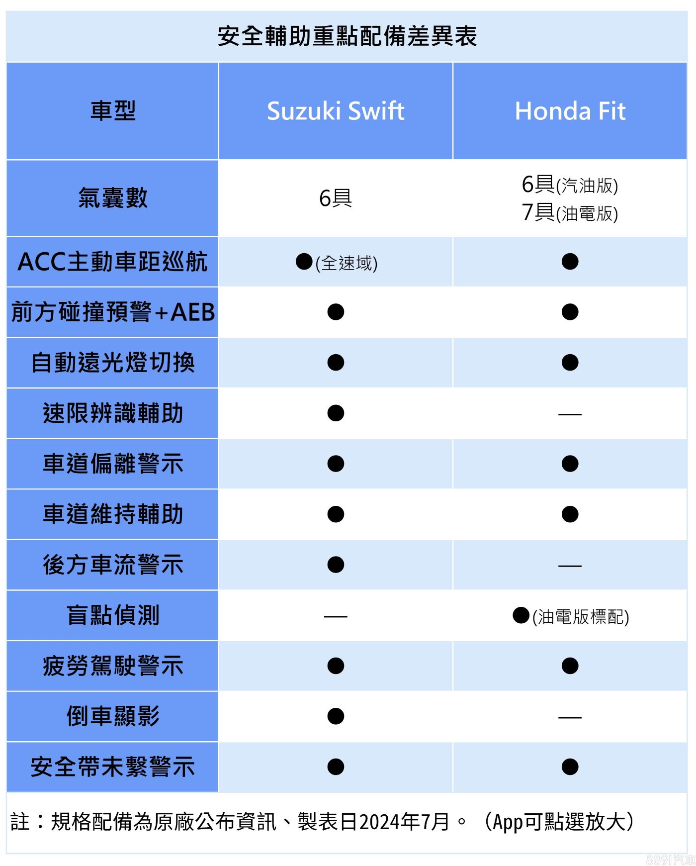 兩車配備上互有亮點,Fit有數位儀錶,資訊顯示較多元,Swift則有螢幕更大的車機,有便利的無線Apple CarPlay/Android Auto,還有加熱座椅可以視需求開啟,不過國內Swift並未引進配備電子手煞車的高規車型,消費者使用體驗可能會扣分,是略為可惜之處。