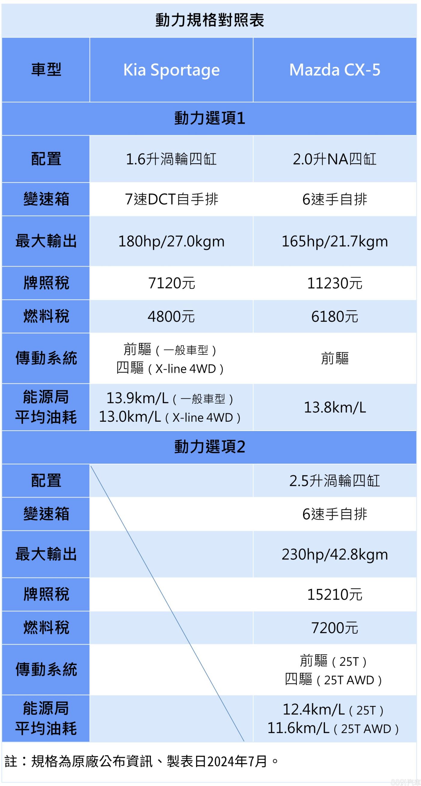 Sportage不分車型,統一搭載180hp的1.6升渦輪四缸引擎與7速DCT,低排氣量的設計帶來稅金優勢,能耗表現也較對手好些,而除了頂規X-line 4WD採四驅配置,其餘車型均為前驅設定。CX-5則提供20S和25T兩種四缸車型,前者採2.0升NA,統一前驅配置;後者則搭2.5升渦輪,不僅輸出較充沛,也提供前驅或四驅可選,但25T牌燃費分級比對手高了2級,每年光賦稅就得多繳逾萬元!