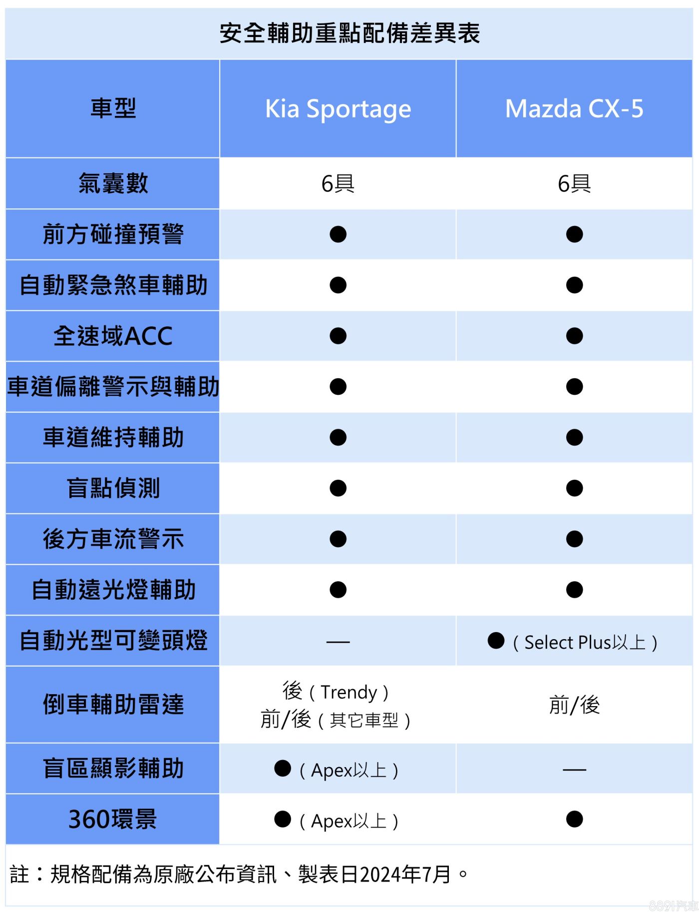 安全面大致可謂平起平坐,兩車系均標配6氣囊,符合Level 2的主動安全輔助也相當完備。Sportage擁有集團常見的車側盲區顯影輔助,但同前停車雷達和360環景,入門以外車型才標配;CX-5則是將前後停車雷達和360環景納入全車系標配,非入門款還具備光型自動可變的ALH頭燈,憑藉更出色的照明技術,足以讓CX-5拿來說說嘴了!