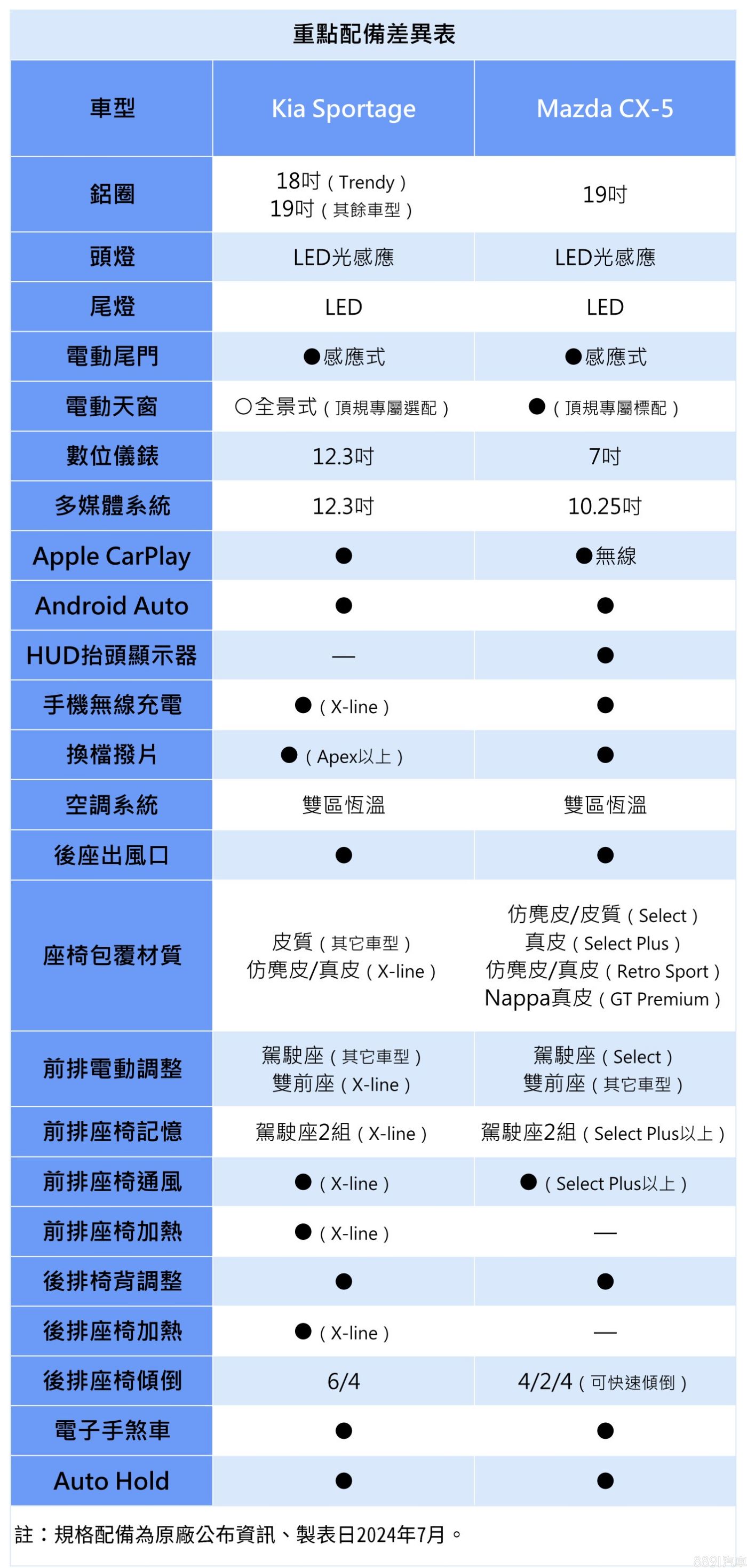 Sportage配備看似豐富,但包含無線充電座、高階椅面包材和多項座椅機能,都只有標配X-line套件的車型才具備,即特仕版和四驅頂規,但雙雙售價近140萬,只適合預算充裕的買家納入考量,全景天窗則限四驅款加價4萬選配。CX-5在不到120萬的20S Select Plus上,配備水準就相當俱全,而全車系標配的無線CarPlay和HUD抬頭顯示器,則彌補雙螢幕均小於對手的不足,但儀錶台設計終究不若對手有科技感又時尚,依然看得出世代差異。