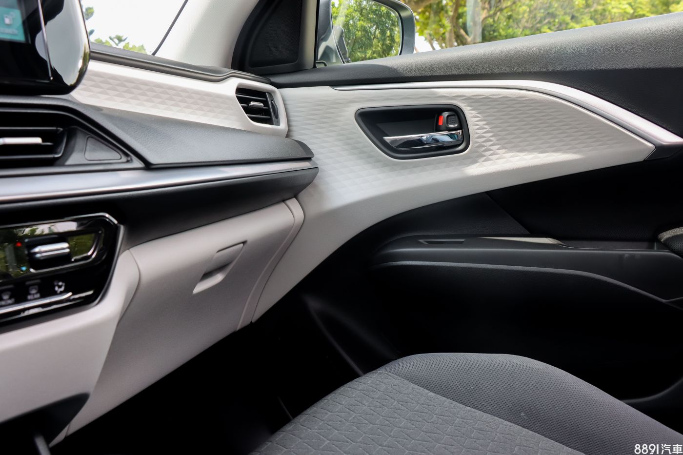 從這張照片不難看出原廠對於質感的追求,除了白黑配色、部分位置更採用格菱狀壓花,配上銀色飾條點綴,確實展現這級距小車少見的內裝水準。
